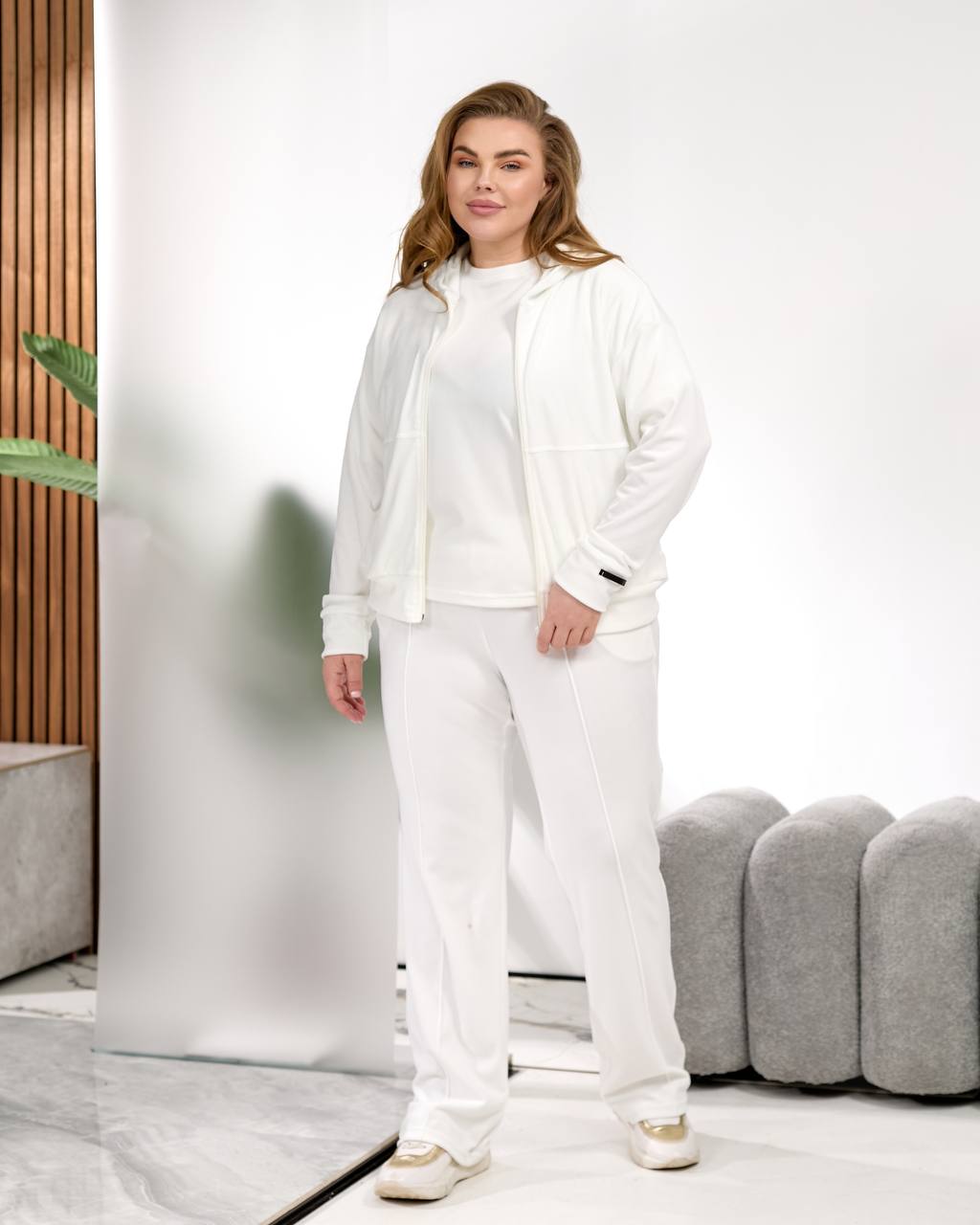 Удобный и комфортный костюм. Футболка с брюками в день, а в вечерние добавляем кофту. Ткань супер качества. Футболка с удлиненным рукавом, брюки прямого кроя, средней посадки с карманами, пояс на резинке. Кофта с капюшоном, со спущенными плечами, карманами по бокам, на змейке.