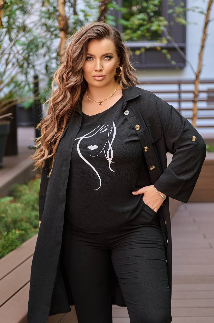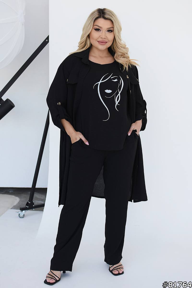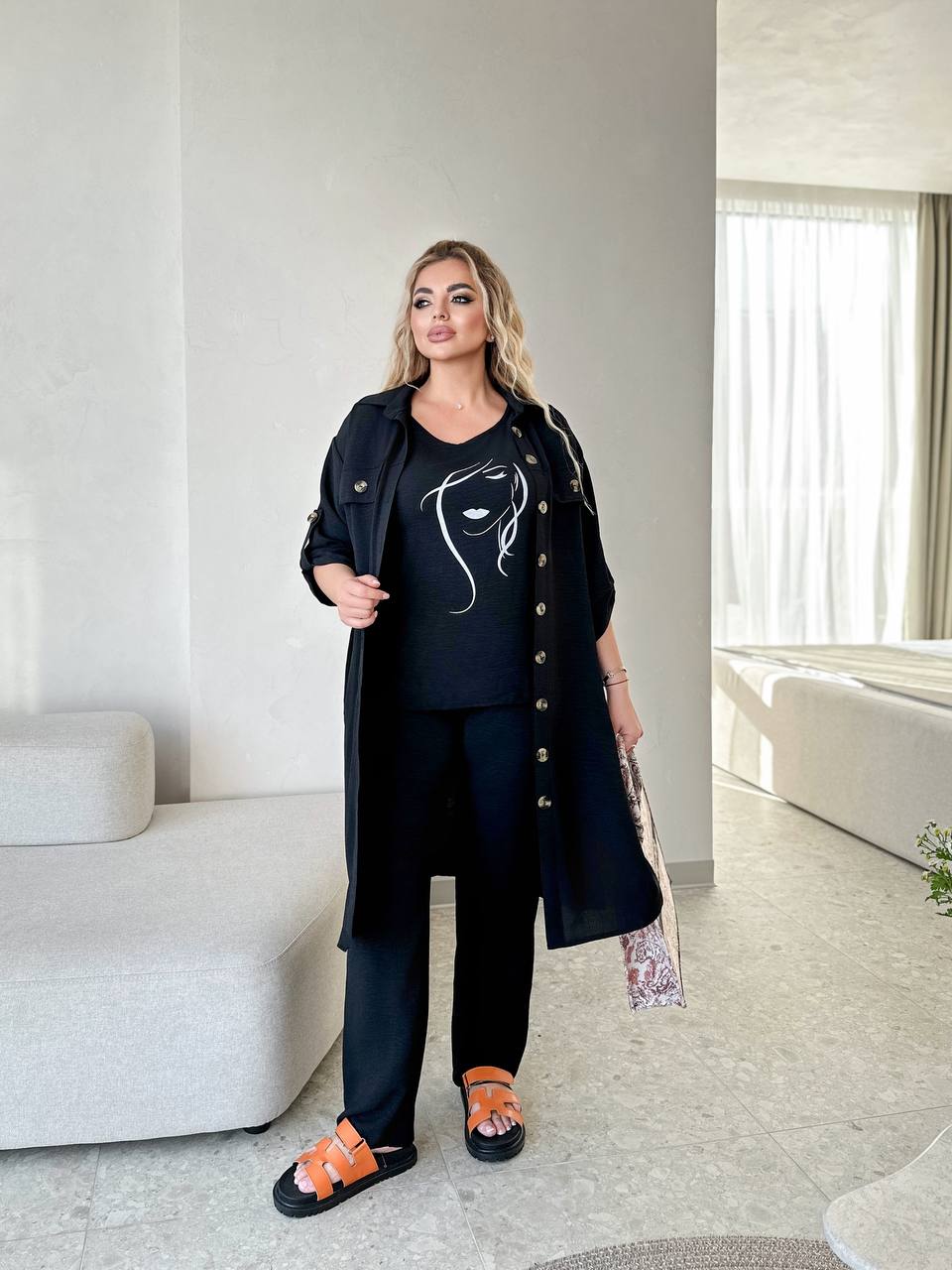 Костюм-тройка с оригинальным накатом, все три детали гардероба можно носить отдельно: блуза с качественным накатом, как на фото, с обеих сторон разрезы; брюки на широкой резинке, по бокам карманы; удлиненная рубашка, застегивающаяся на пуговицы, рукав на патике с пуговицей (длину возможно регулировать), на груди карманы с пуговицей.