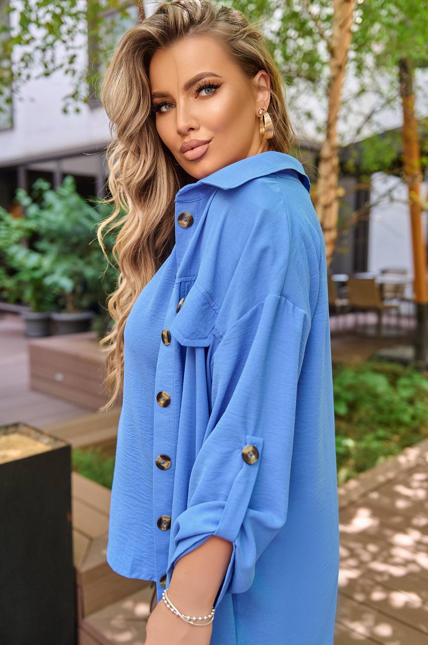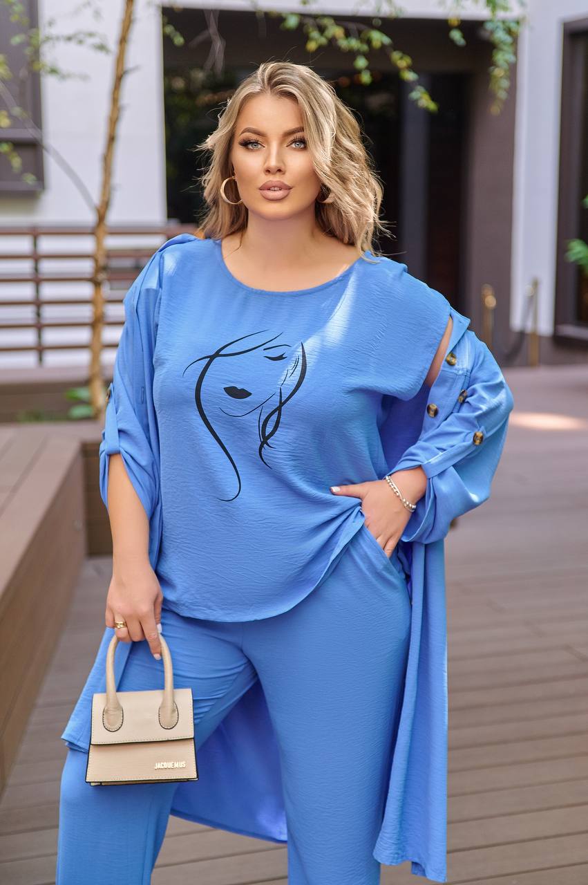 Костюм-тройка с оригинальным накатом, все три детали гардероба можно носить отдельно: блуза с качественным накатом, как на фото, с обеих сторон разрезы; брюки на широкой резинке, по бокам карманы; удлиненная рубашка, застегивающаяся на пуговицы, рукав на патике с пуговицей (длину возможно регулировать), на груди карманы с пуговицей.