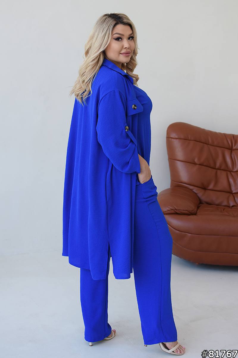Костюм-тройка с оригинальным накатом, все три детали гардероба можно носить отдельно: блуза с качественным накатом, как на фото, с обеих сторон разрезы; брюки на широкой резинке, по бокам карманы; удлиненная рубашка, застегивающаяся на пуговицы, рукав на патике с пуговицей (длину возможно регулировать), на груди карманы с пуговицей.