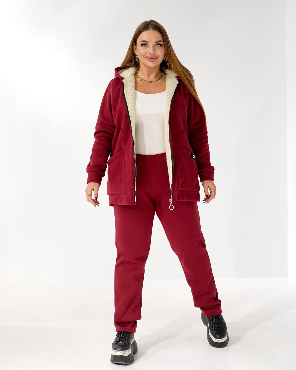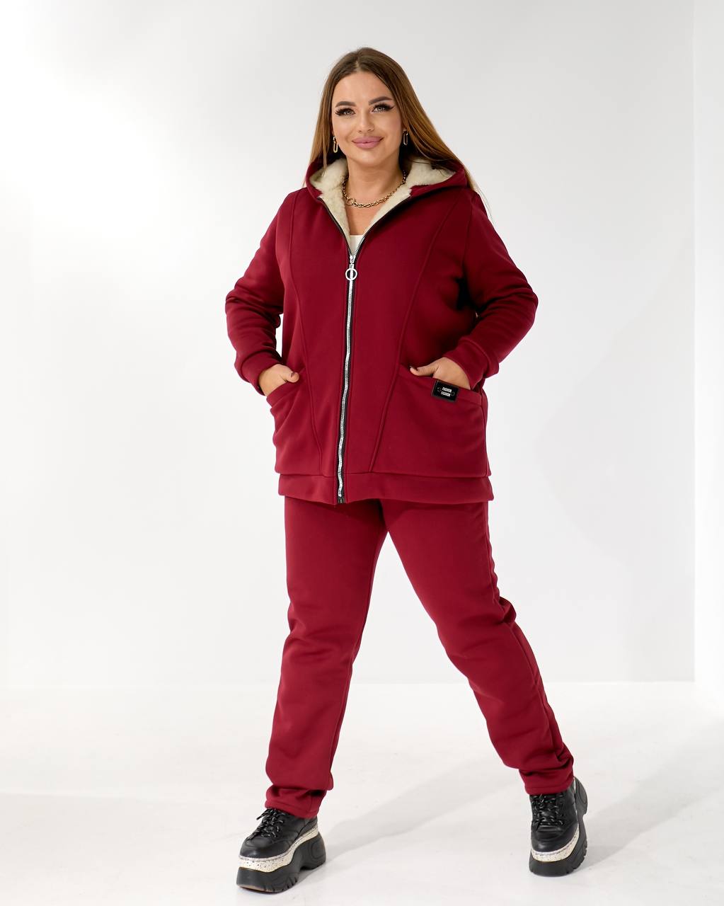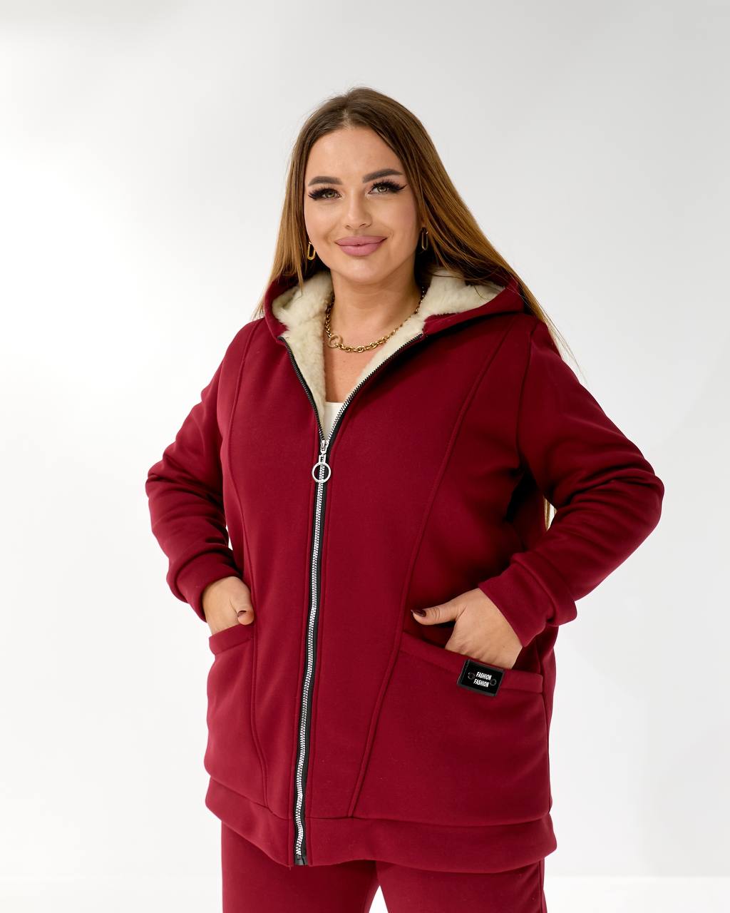Ткань: трикотаж трехнить начес, подкладка (полочка и спинка, капюшон) искусственная овчина