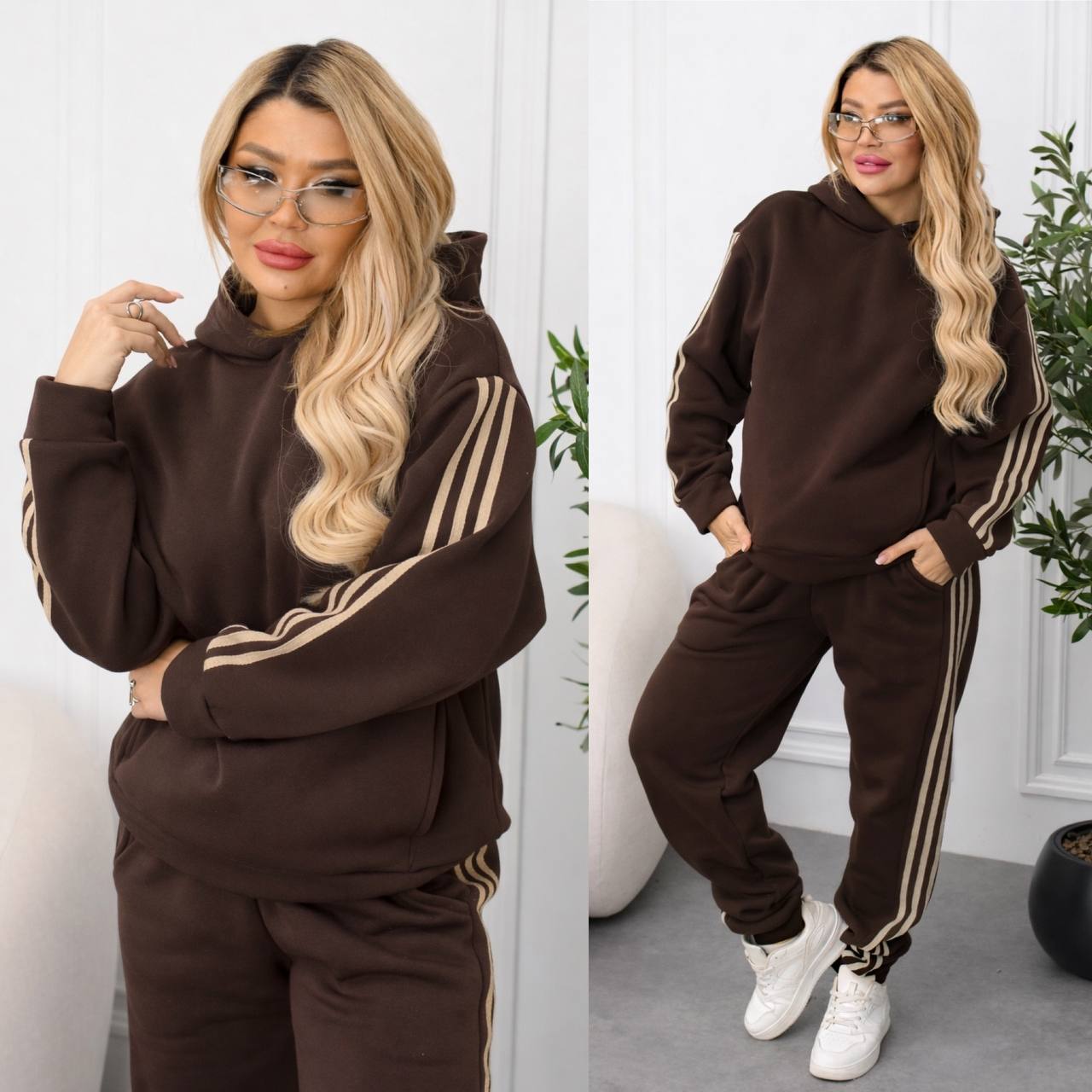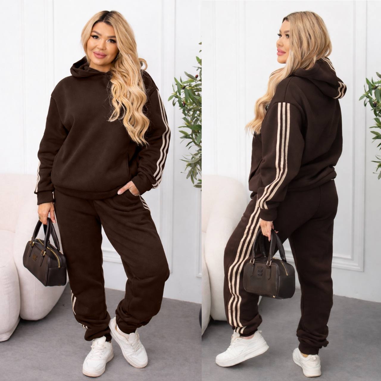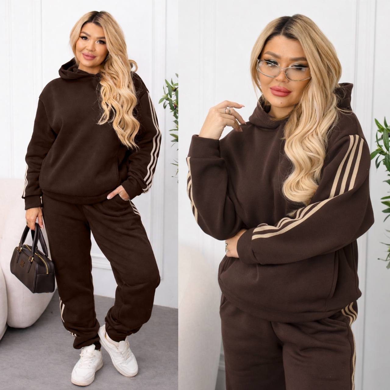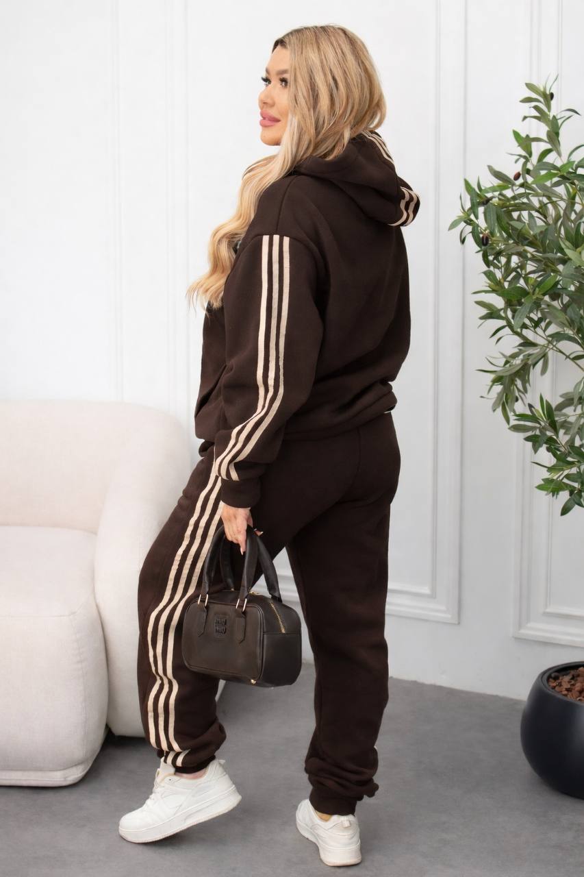Мягкая теплая ткань, свободный крой, удобные брошенные в кофте и брюках, а также акцентные лампасы по бокам