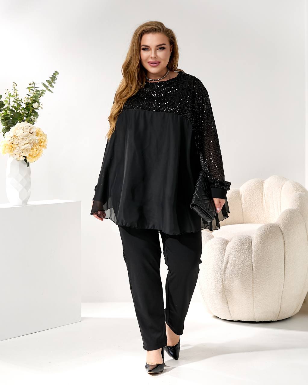 2. Брюки (брюки): прямого/немного суженного силуэта, из креп-дайвинга, с лампасами из пайетки, визуально вытягивающими силуэт! 👖⬆️