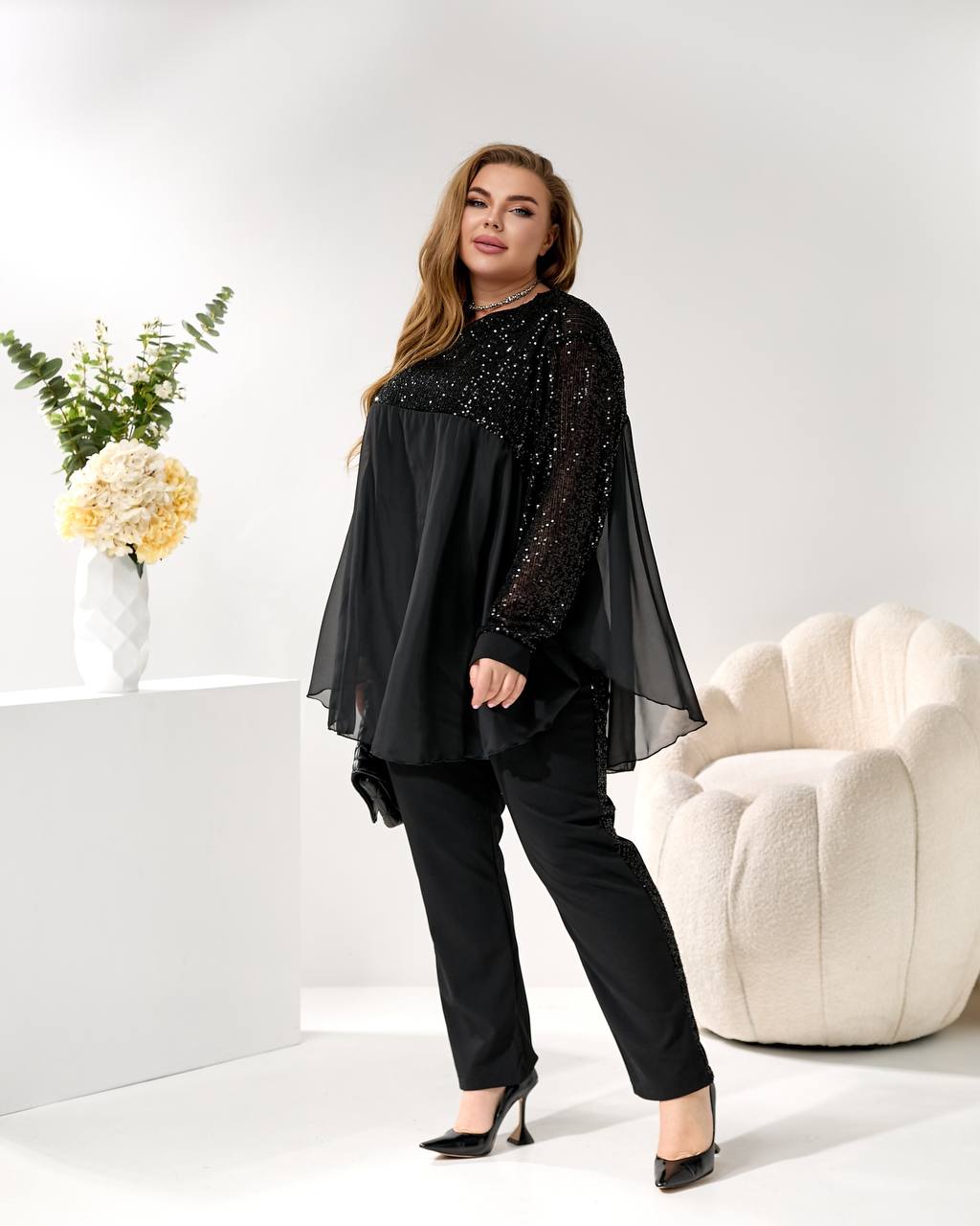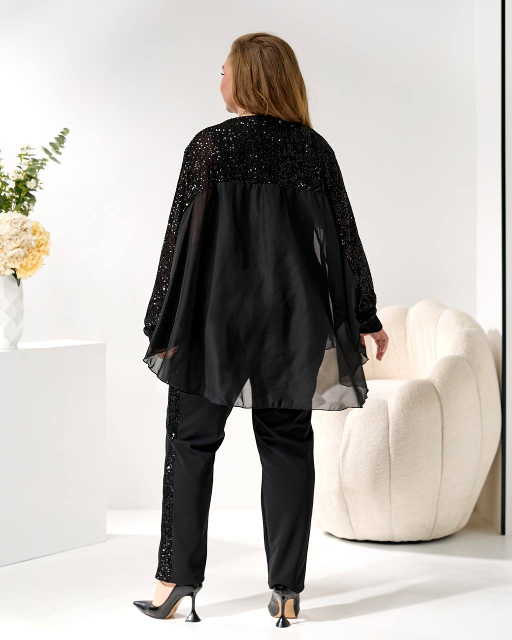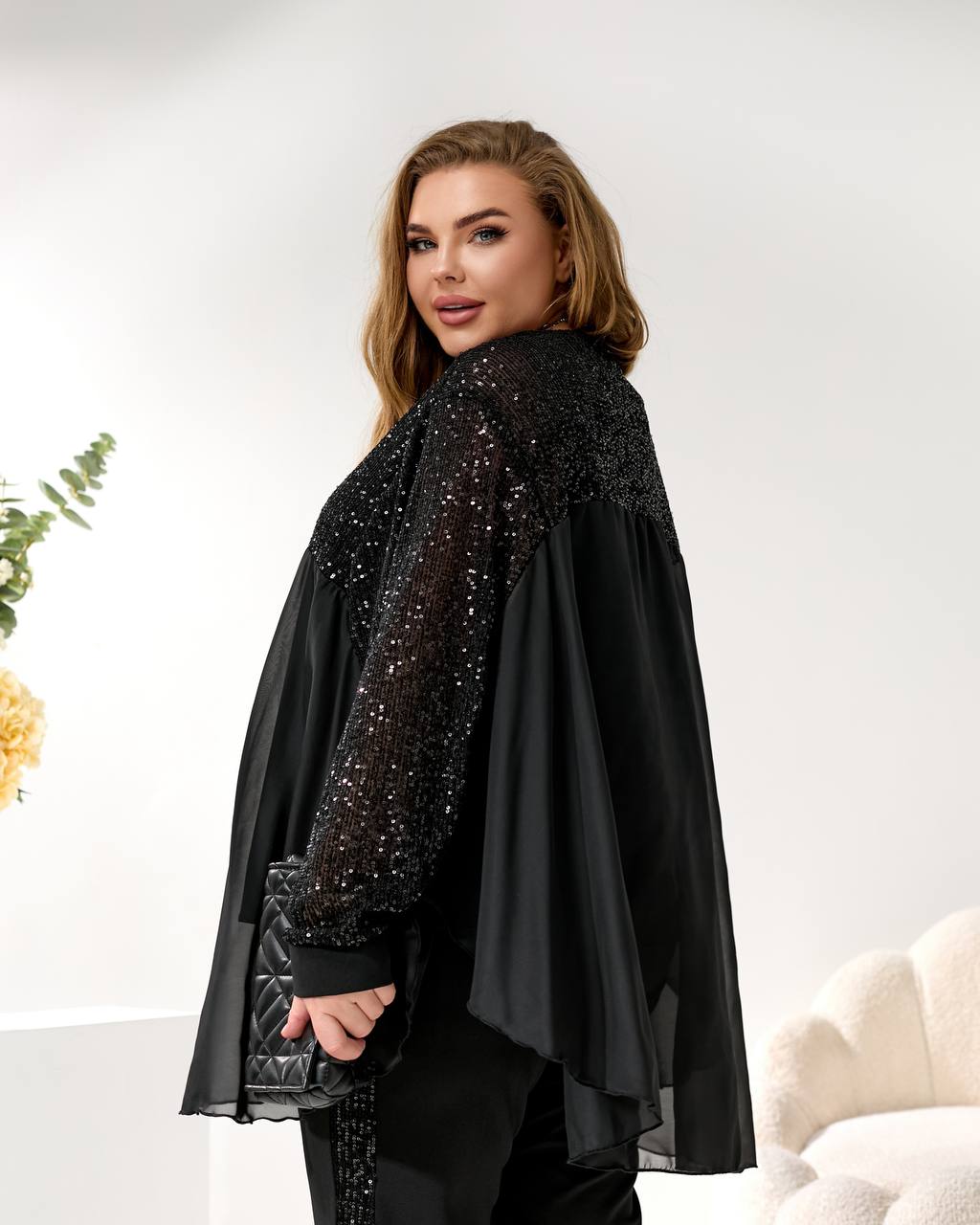 3. Накидка/Туника: Свободный, летучий крой из шифона с отделкой пайетками на плечах и рукавах. Можно носить поверх майки или стильный жакет. 🦋🧥