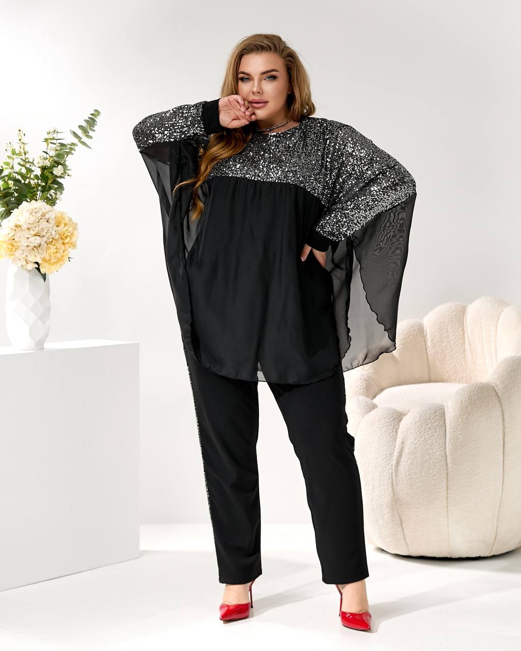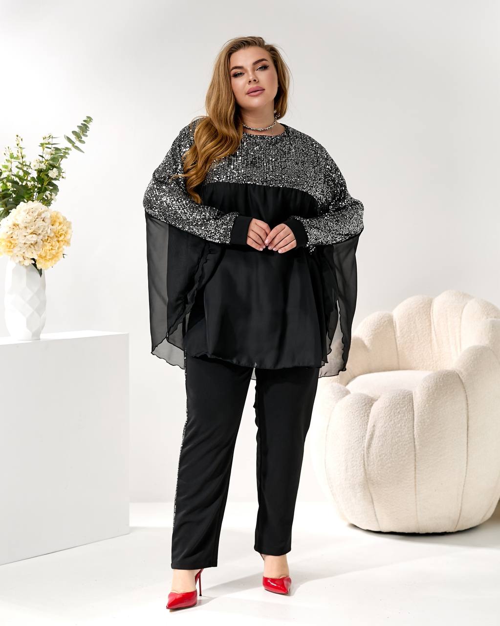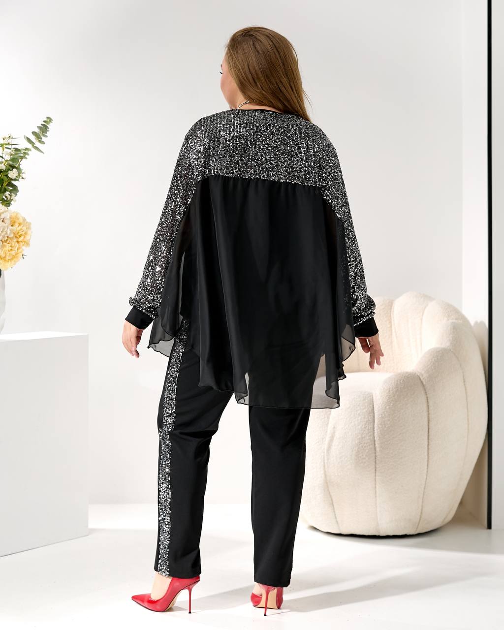 3. Накидка/Туника: Свободный, летучий крой из шифона с отделкой пайетками на плечах и рукавах. Можно носить поверх майки или стильный жакет. 🦋🧥