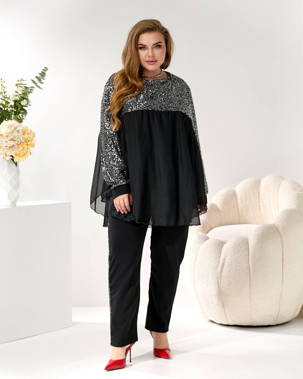 2. Брюки (брюки): прямого/немного суженного силуэта, из креп-дайвинга, с лампасами из пайетки, визуально вытягивающими силуэт! 👖⬆️