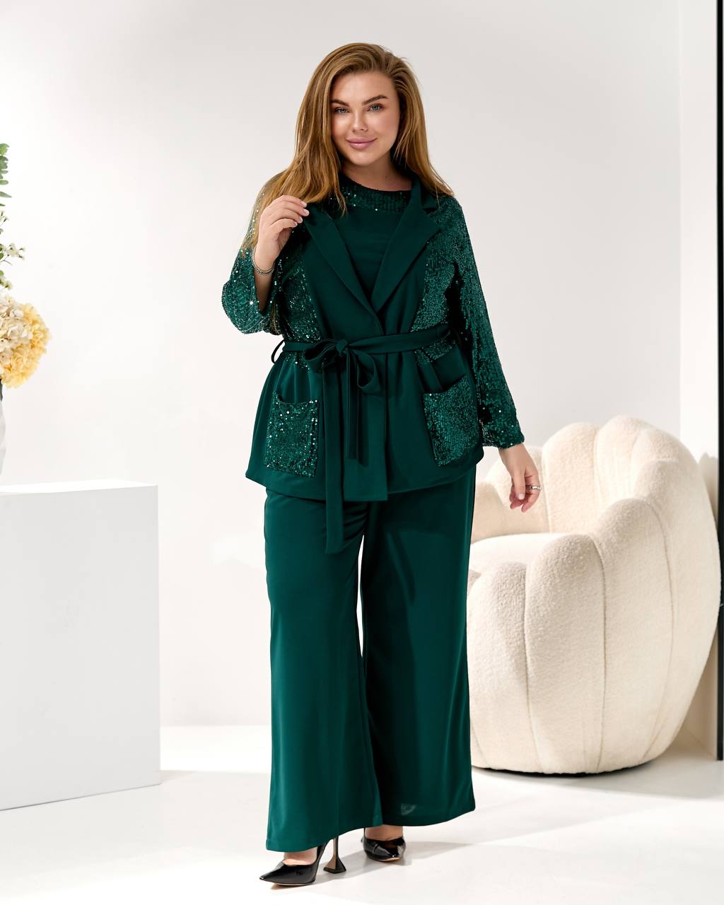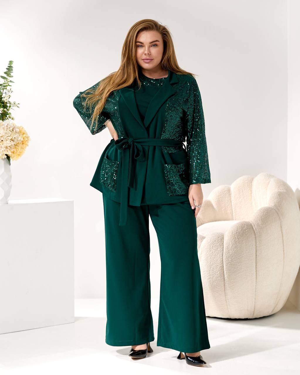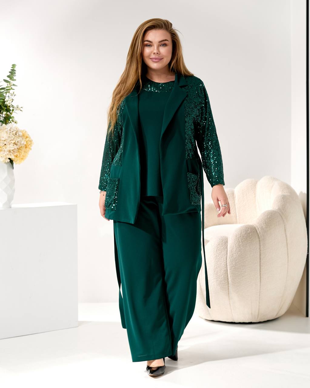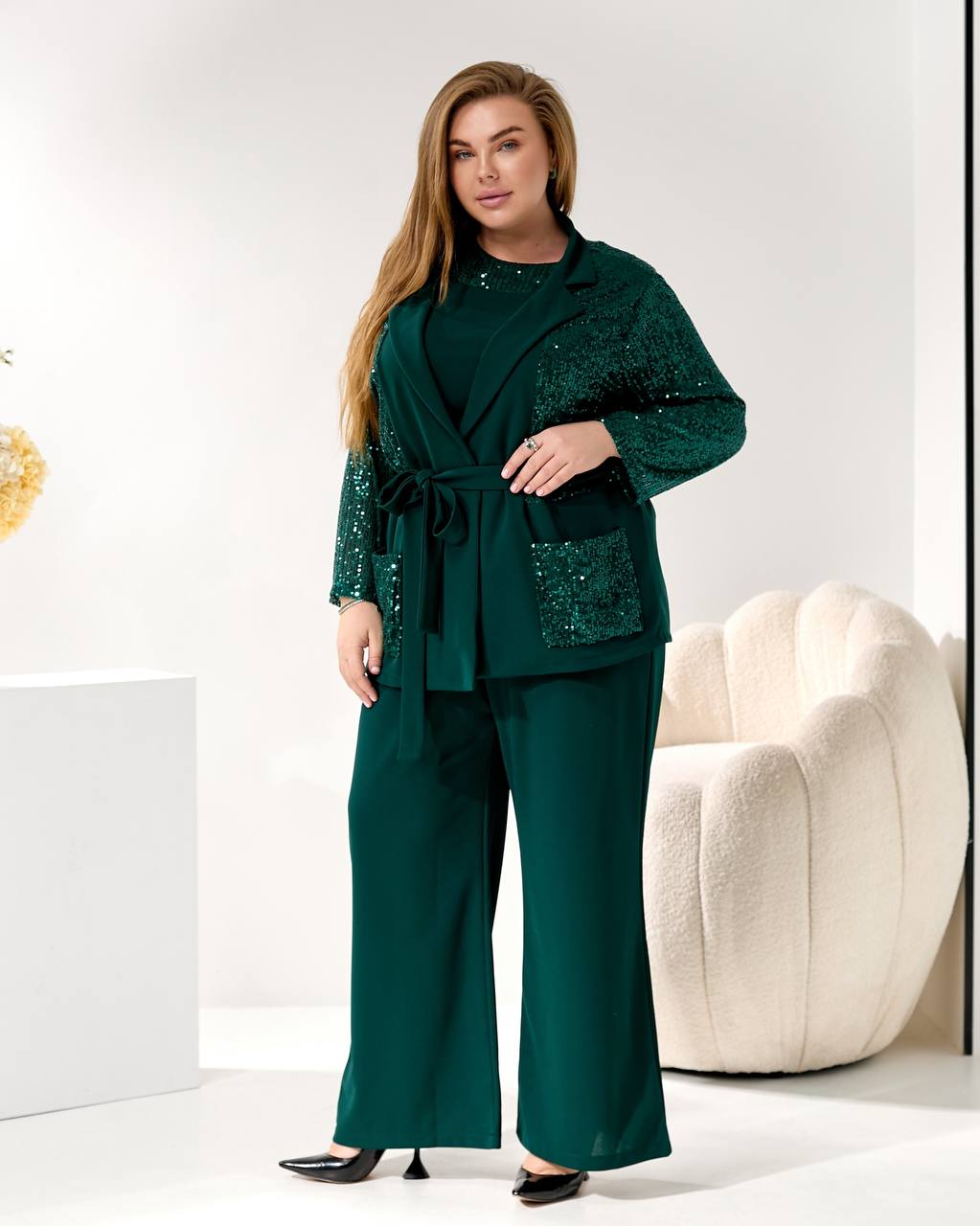 Представляем элегантный и модный брючный костюм, созданный, чтобы подчеркнуть вашу индивидуальность на любом торжестве. Идеальный наряд для корпоратива 🥂, новогодней вечеринки 🎄, дня рождения 🎂 или любого вечернего мероприятия.