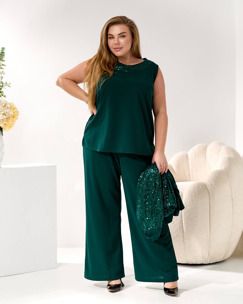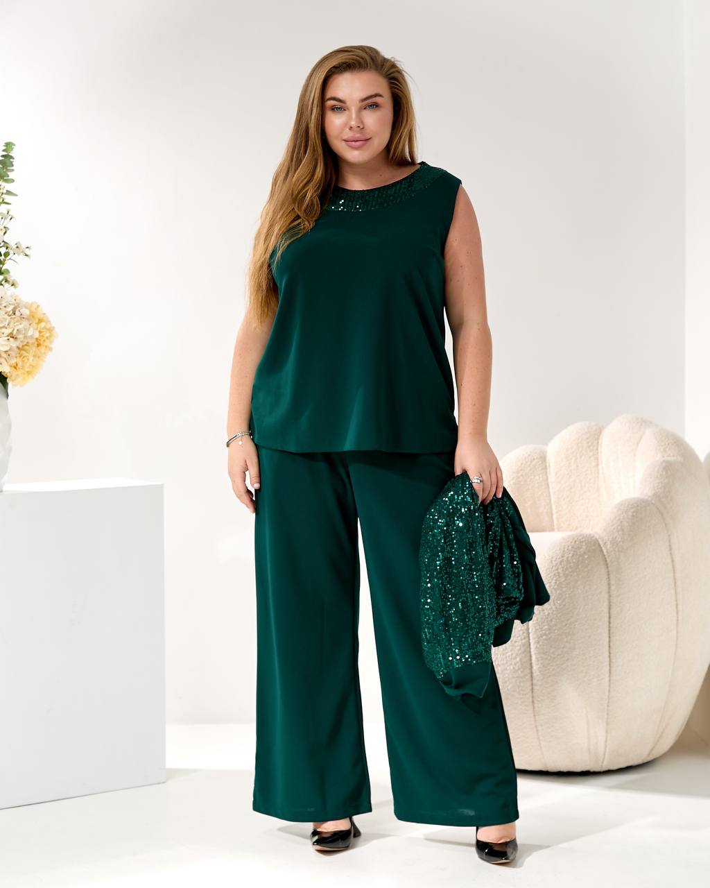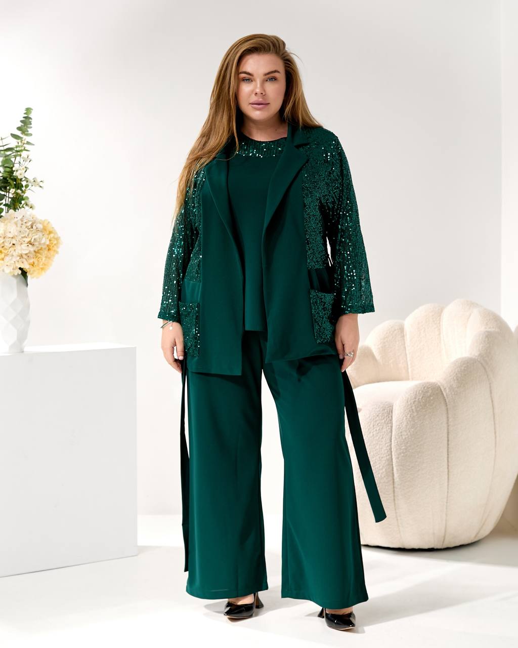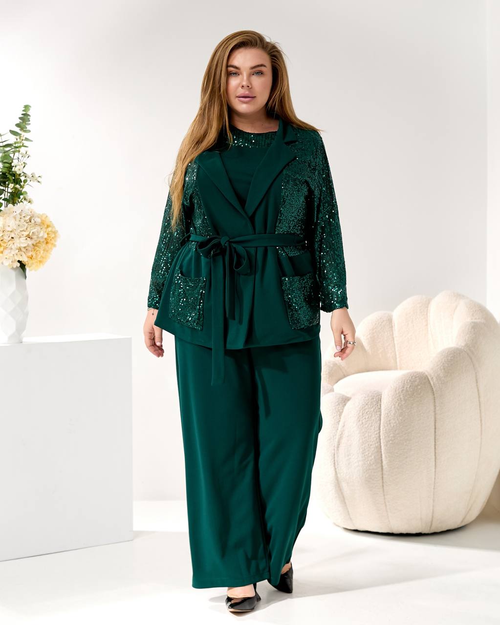Представляем элегантный и модный брючный костюм, созданный, чтобы подчеркнуть вашу индивидуальность на любом торжестве. Идеальный наряд для корпоратива 🥂, новогодней вечеринки 🎄, дня рождения 🎂 или любого вечернего мероприятия.