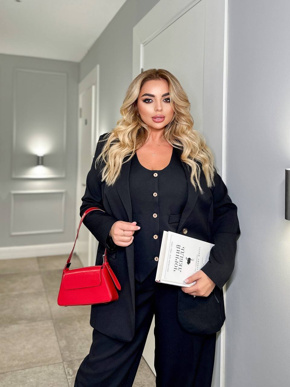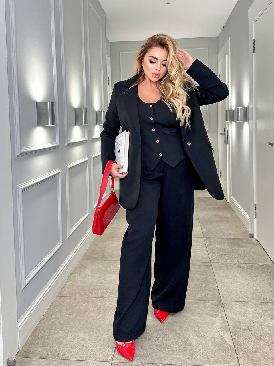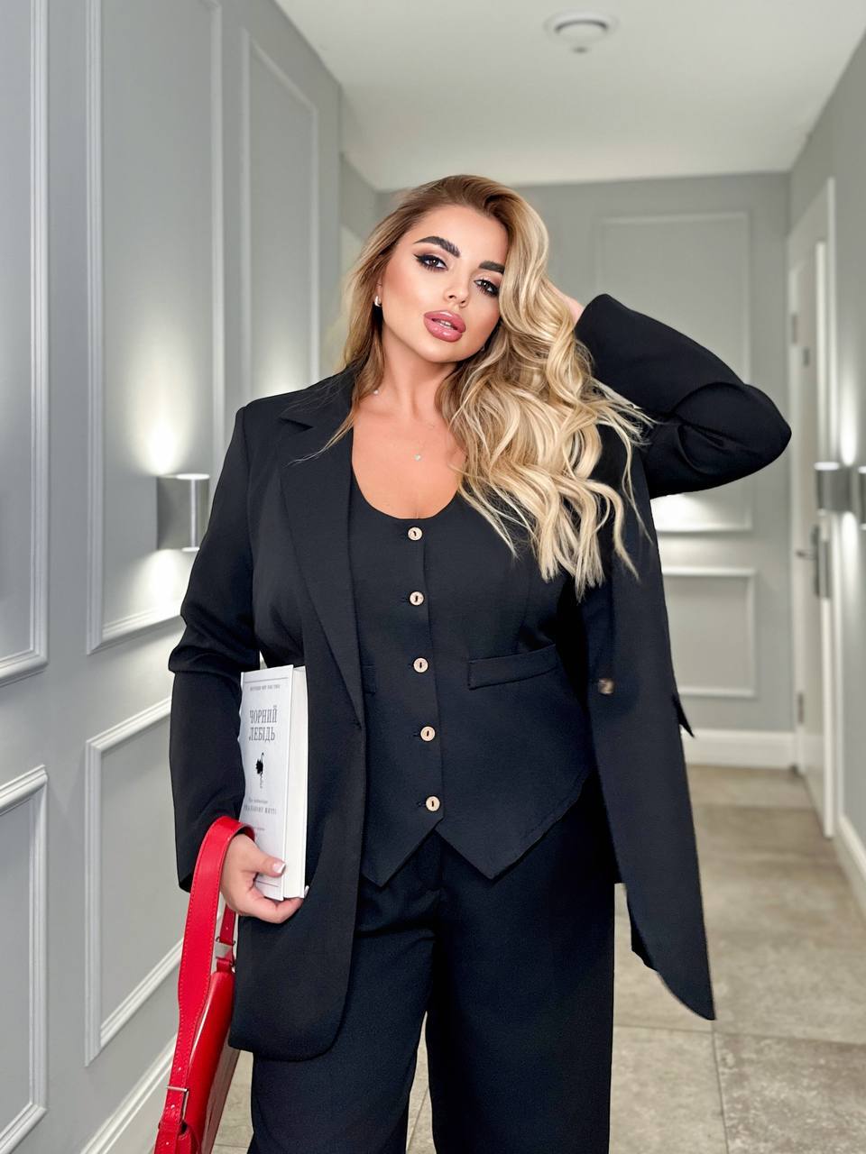 54-56: Пиджак: ОГ 124 см, ОТ 124 см, ОБ 134 см, рукав 64 см, длина изделия 82 см. Жилет ОГ 116 см, ОТ 114 см, обхват низа 116 см, длина изделия 59 см. Брюки: ОТ 100 см, ОБ 130 см, длина изделия 111 см