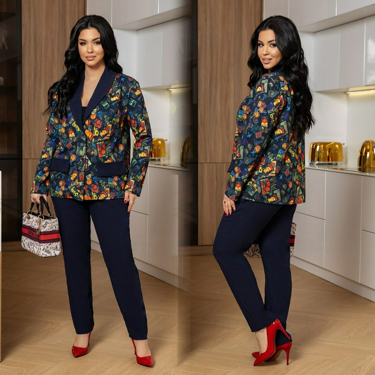 Практичный костюм, брюки прямого покроя, с боковыми карманами, пояс на резинке. Пиджак на пуговицах, прямого покроя.