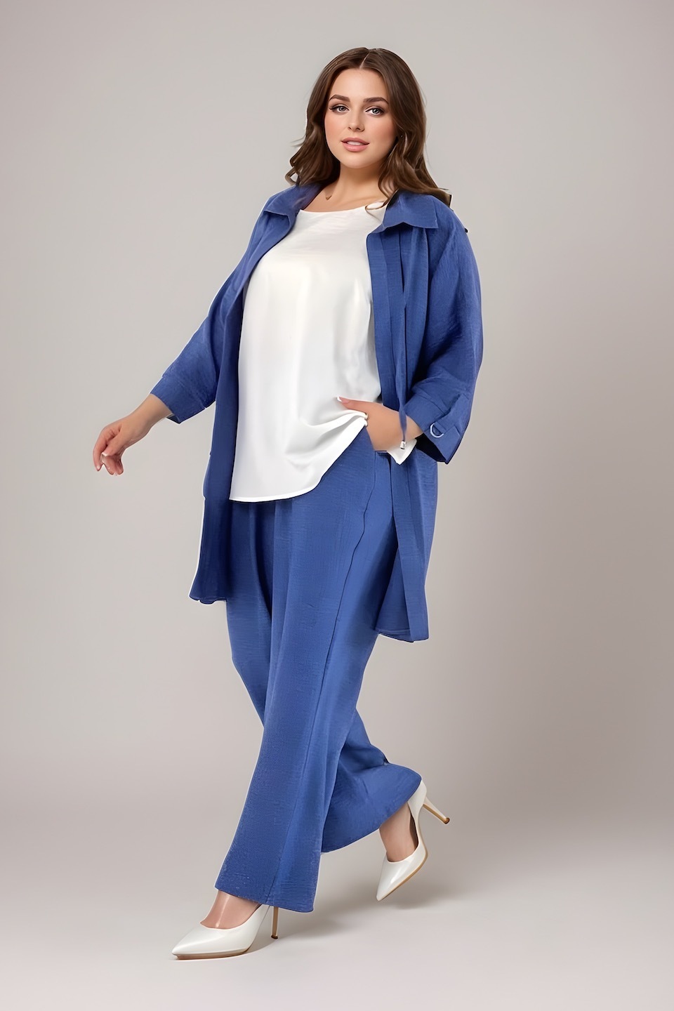 Костюм из мягкого материала состоит из удлиненного жакета и брюк. прямые широкие брючины свободного кроя отлично сидят за счет широкой эластичной резинки на поясе по спинке. по бокам практичные карманы.