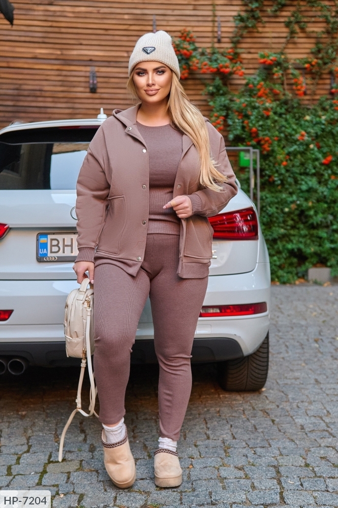 Костюм-тройка: удлиненный кардиган на кнопках, на рукавах интересный крой манжета + именная нашивка, глубокие карманы, глубокий двойной капюшон, рубчик на карманах и рукавах, майка и лосины из рубчика, лосины на широкой резинке, высокая посадка.