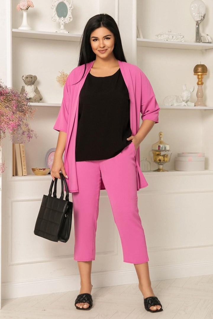 Практический повседневный и праздничный костюм. Тоненькая ткань, приятная к телу. Брюки прямого покроя с карманами, пояс на резинке. Кардиган свободного покроя. Блуза прямого покроя.