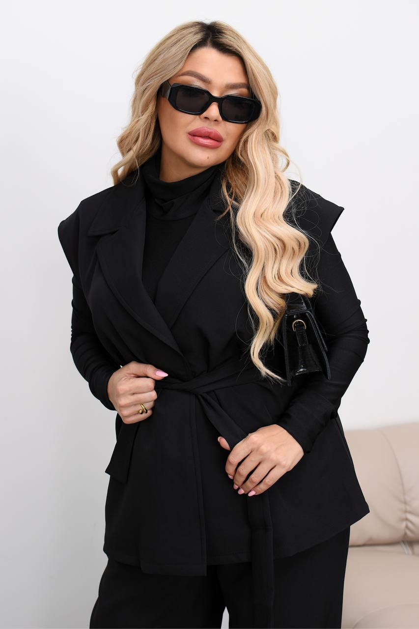 Элегантный костюм-двойка из костюмной ткани – выбор для женщин, которые ценят комфорт и стиль. прямые брюки визуально вытягивают силуэт, а удлиненный жилет с английским воротником придает образу утонченности. модель на запахе с поясом акцентирует талию, создавая женственный силуэт. идеален как для деловых встреч, так и для стильных прогулок по городу.