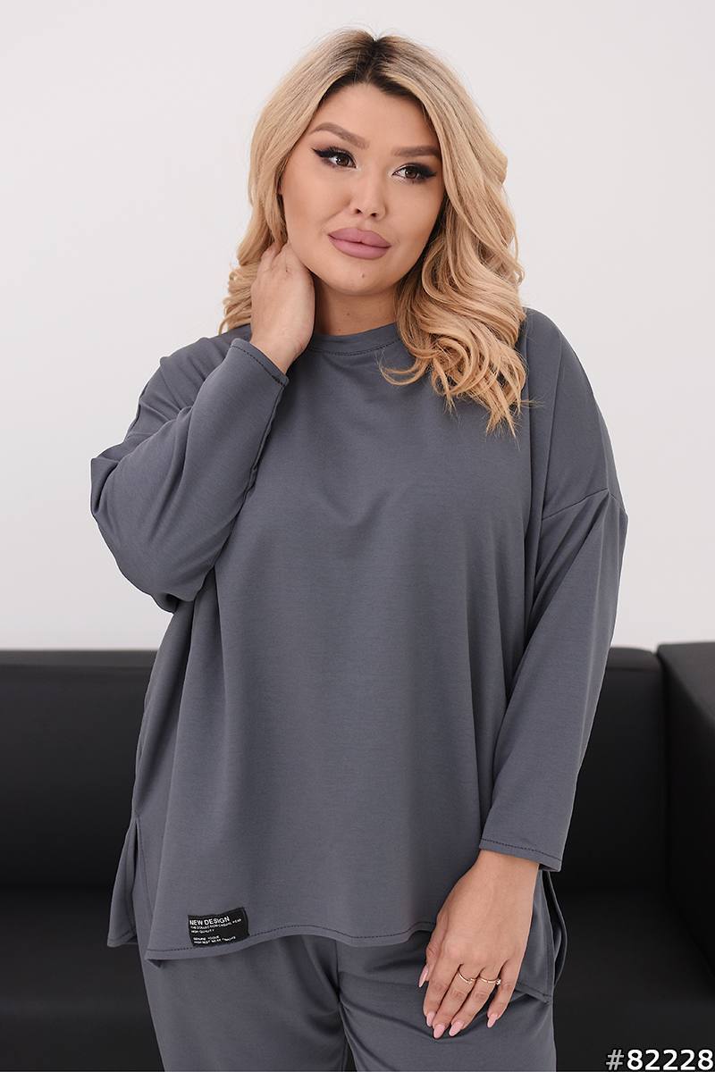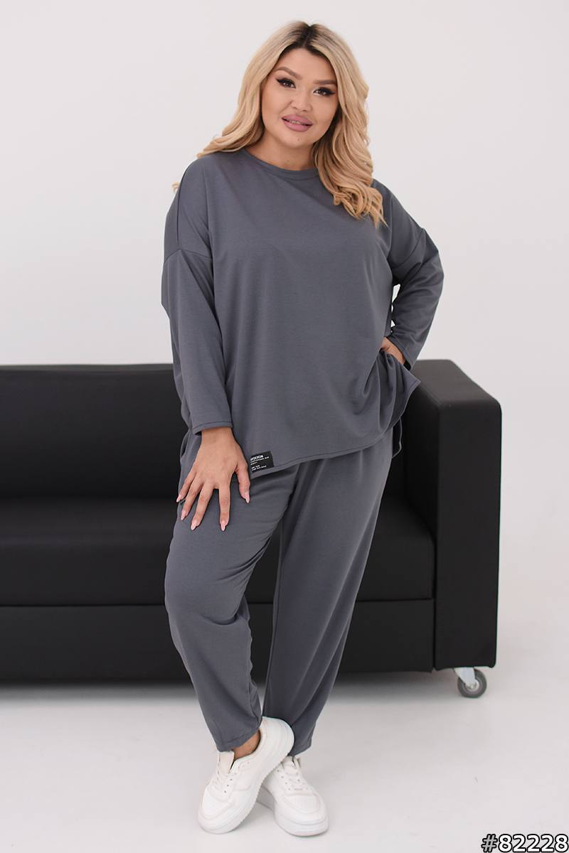 Костюм свободного кроя, свитшот объемный, спинка чуть длиннее перед, рукав 7/8.Штаны на резинке, с карманами, свободного силуэта