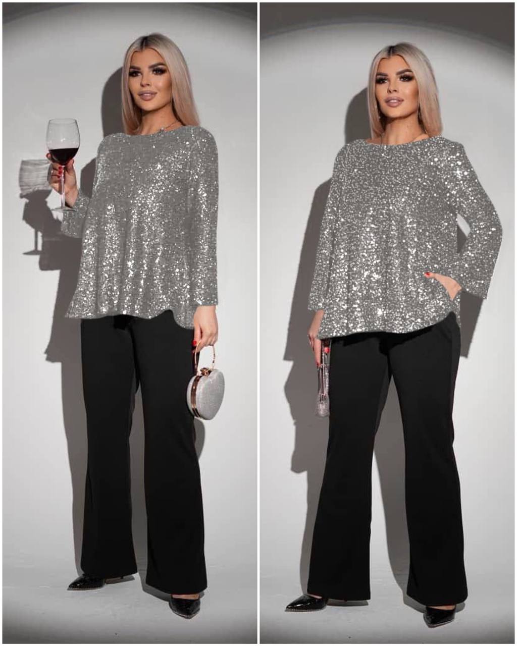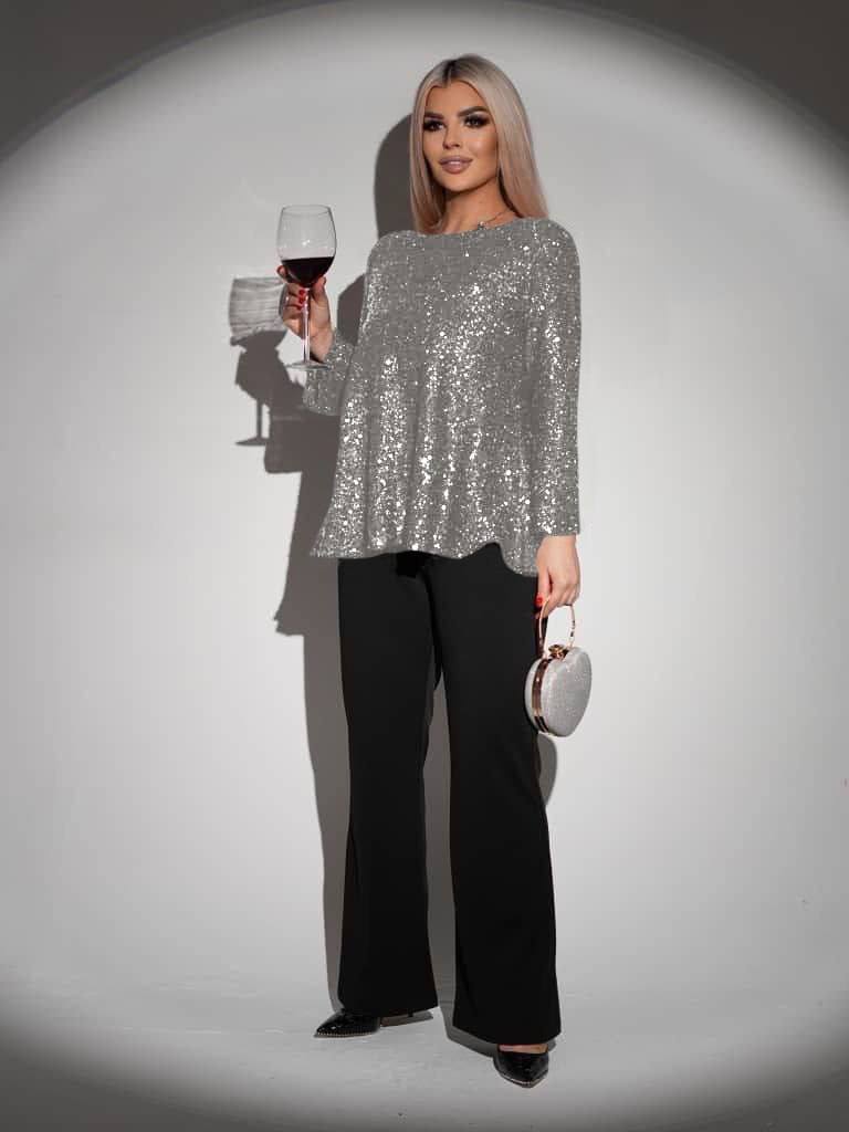 Верх — красиво сияющая кофта, придающая образу элегантности.