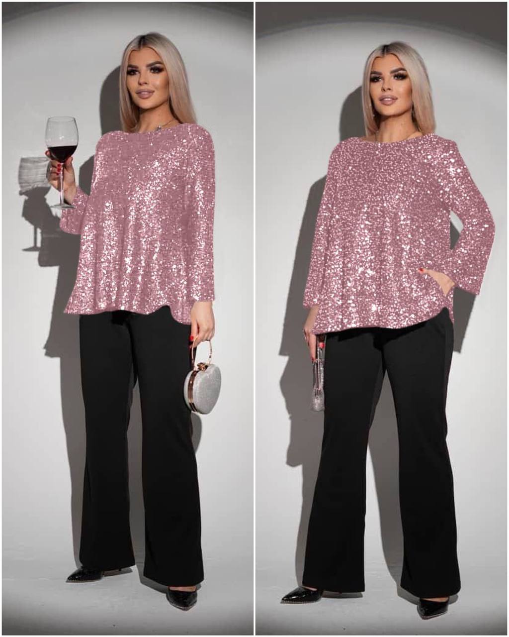 Верх — красиво сияющая кофта, придающая образу элегантности.