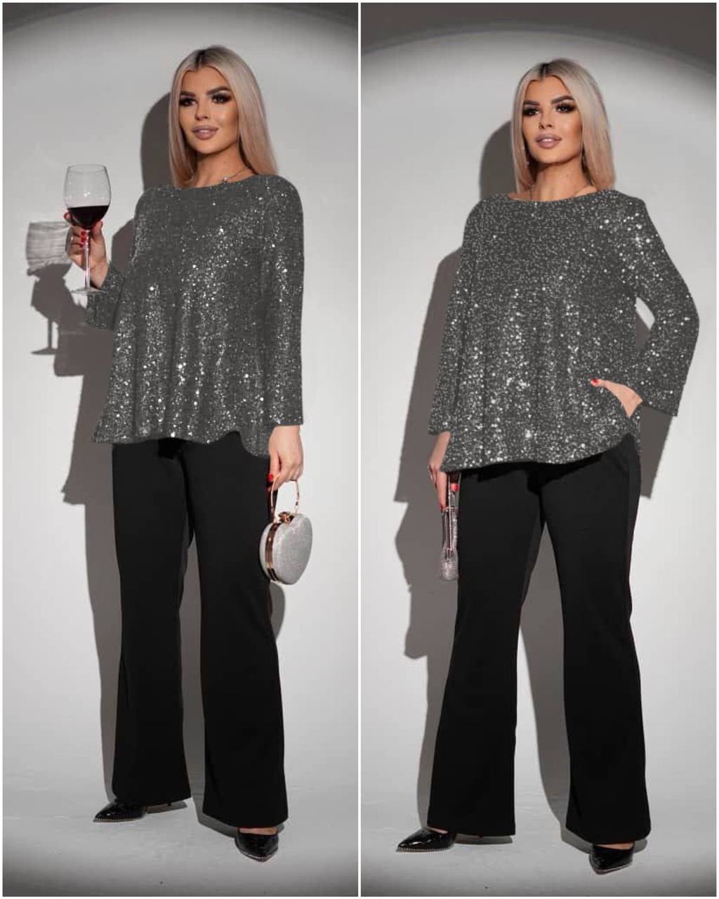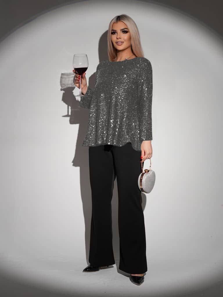 Верх — красиво сияющая кофта, придающая образу элегантности.