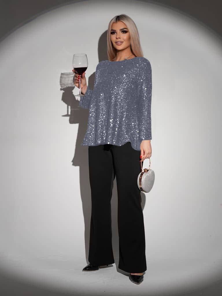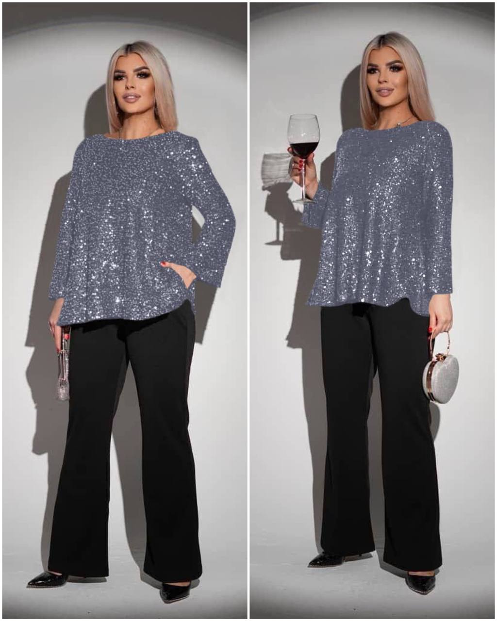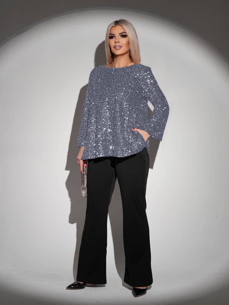 Верх — красиво сияющая кофта, придающая образу элегантности.