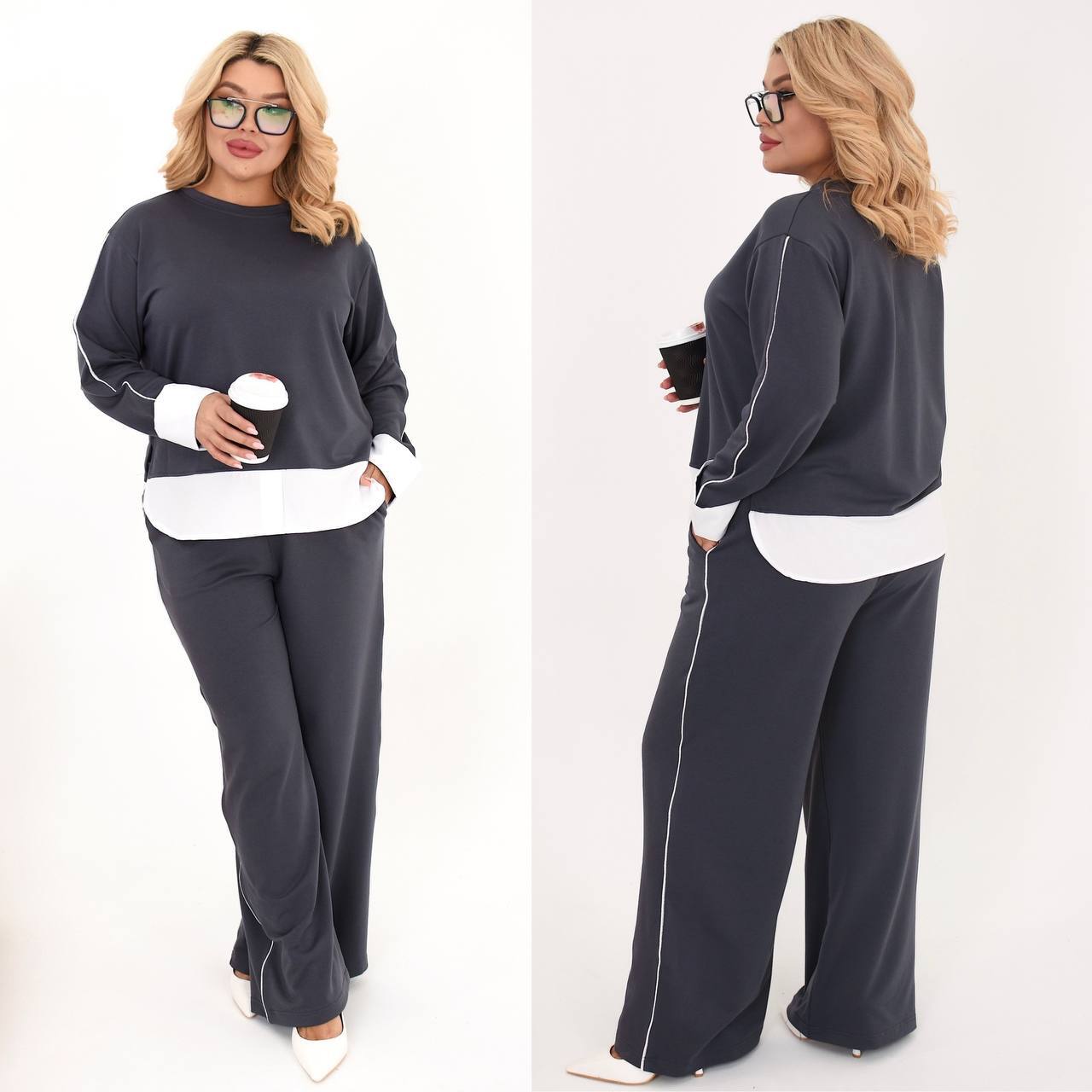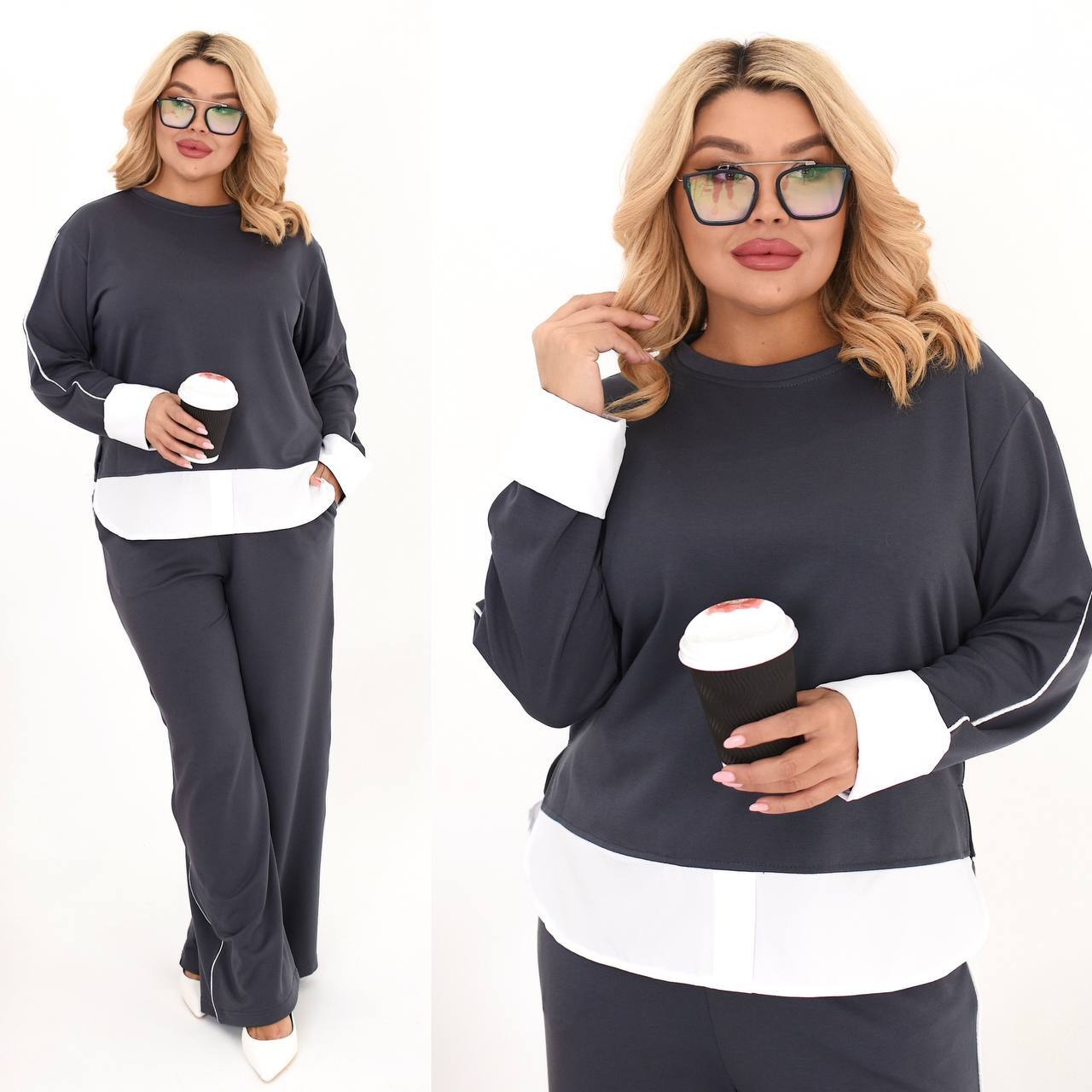Кофта оригинального кроя выполнена из трикотажа с добавлением белого супер софта на рукавах и снизу с имитацией рубашки. .Брюки дворец средней посадки на резинке с карманами. Рукава кофты и брюки украшены белой лентой, придающие изделию яркости.