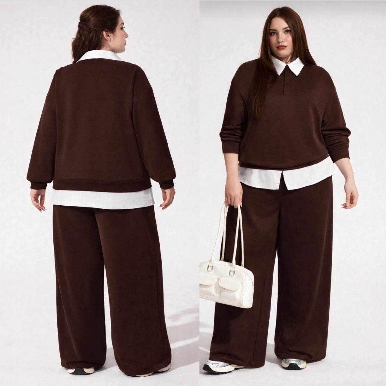 Кофта оригинального кроя выполнена из трикотажа с добавлением белого супер софта на воротнике и снизу с имитацией рубашки. Брюки средней посадки на резинке с карманами.