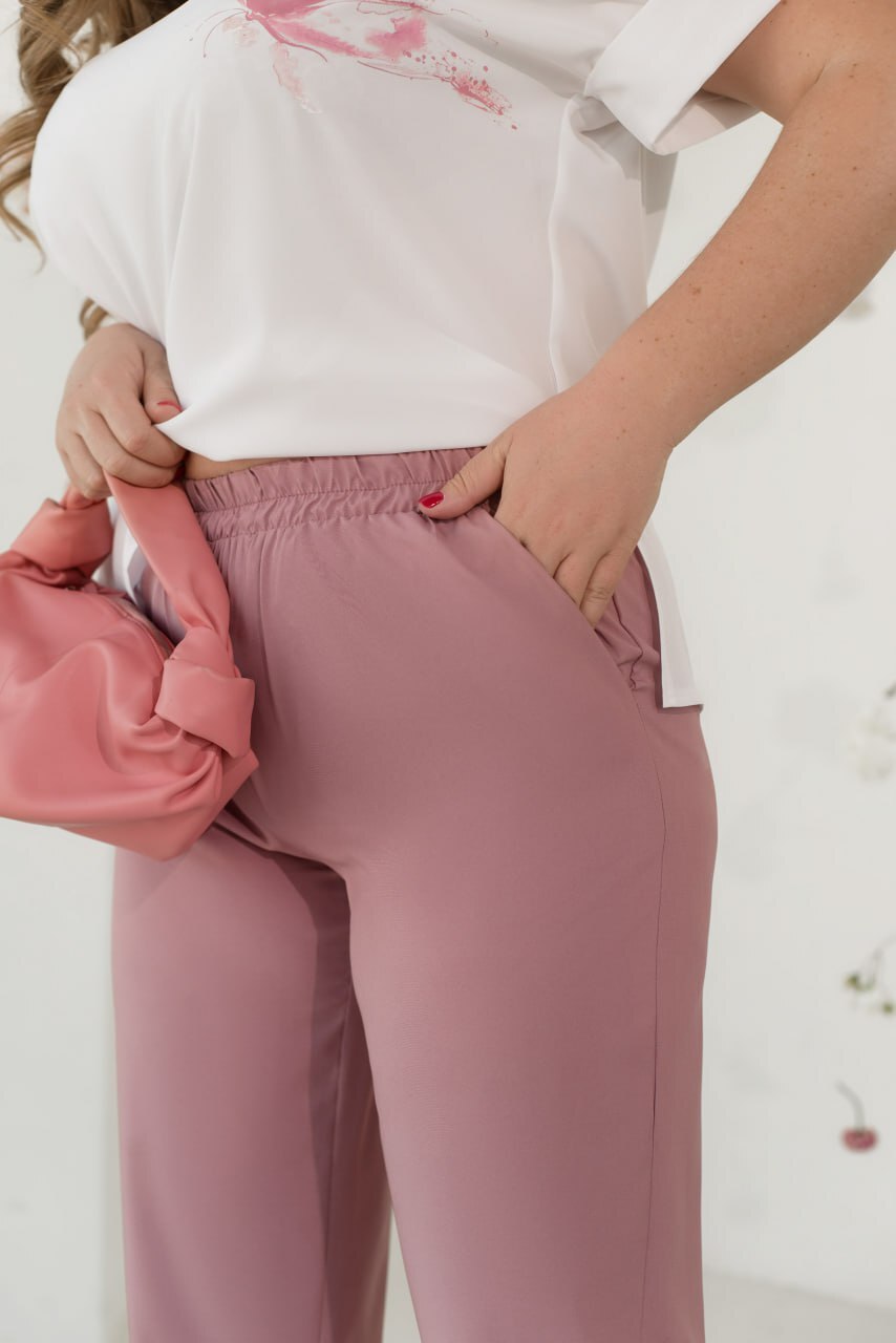 Невероятный легкий костюм-двойка с брюками прямого кроя дополнит твой летний гардероб. Белая блуза свободного кроя имеет яркий узор. карманчики по бокам.