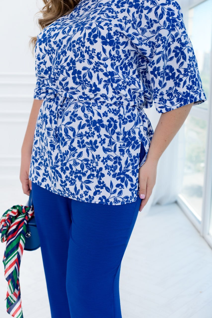 Самый удобный костюм свободного фасона. Удлиненная футболка без застежек и карманов. Через талию под кулиской пропущен шнурок, по бокам подола – разрезы. Вырез горловины полукруглый. На рукавах небольшие отвороты. Брюки с высокой талией, по пояс вшита резинка, по бокам – карманы в шве.