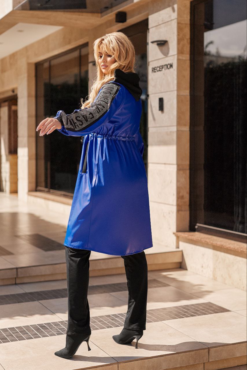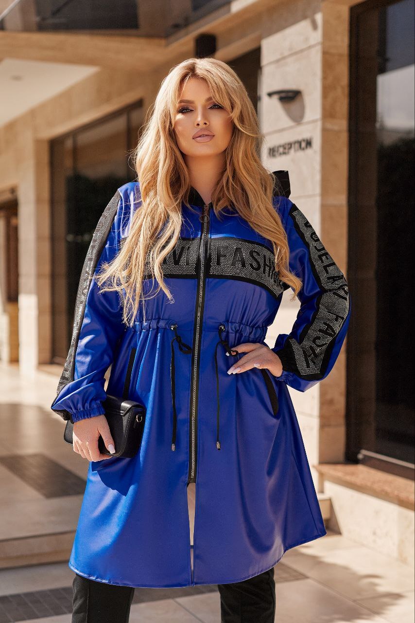 Эко кожа хорошего качества, капюшон и вставки из двунитки, оформлены стразами высокого качества DMS, хорошо держатся – прошли термообработку на специальном оборудовании, на поясе идет кулиска для фиксации талии.