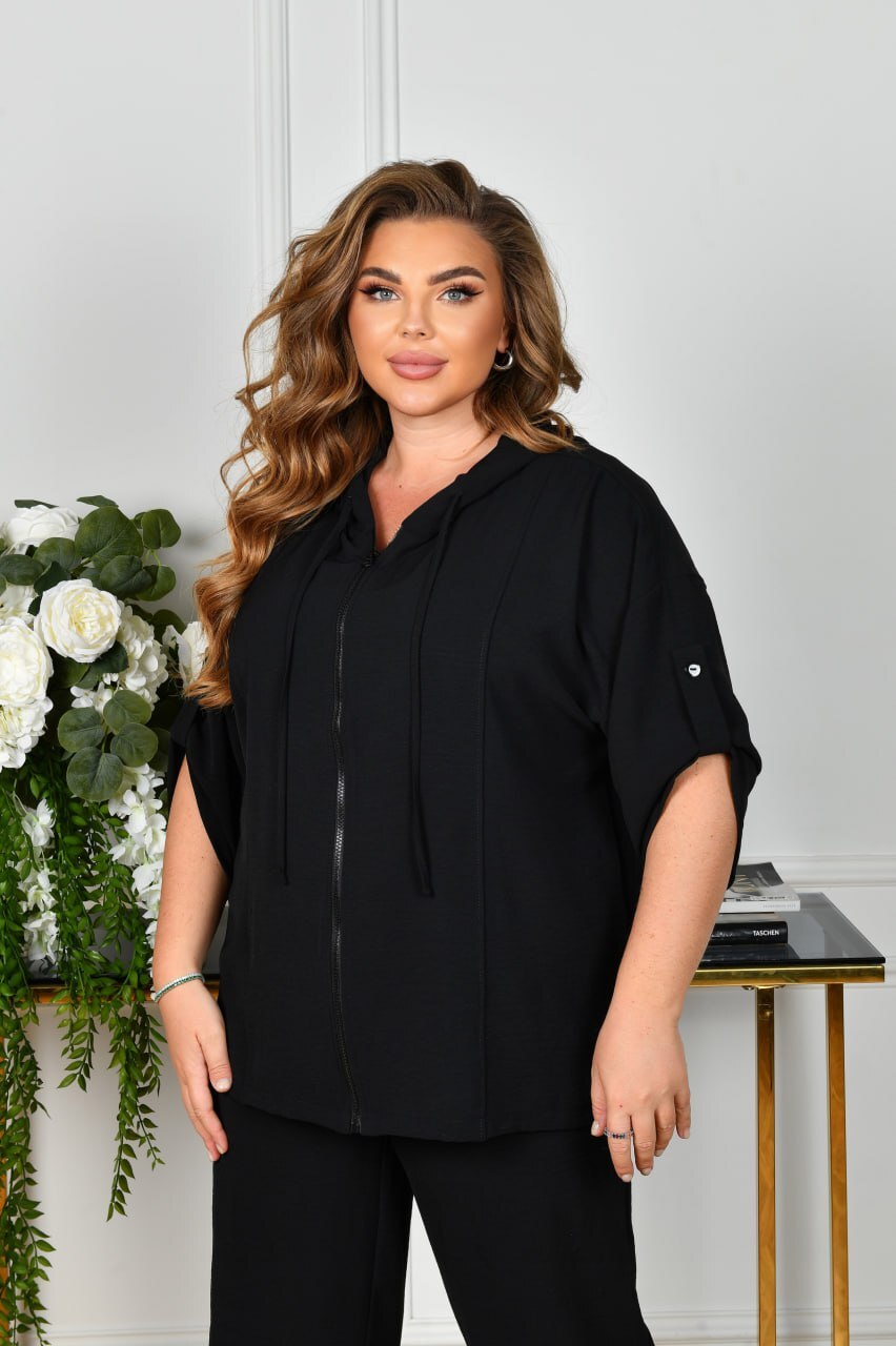 Туника на молнии с капюшоном. Силуэт свободный, прямой. Линия плеча спущена, рукав длиной ниже локтя, можно укорачиваться с помощью специальной детали на пуговице. В кулиске капюшона протянут шнурок. Можно надевать на майку (футболку) или самостоятельно.