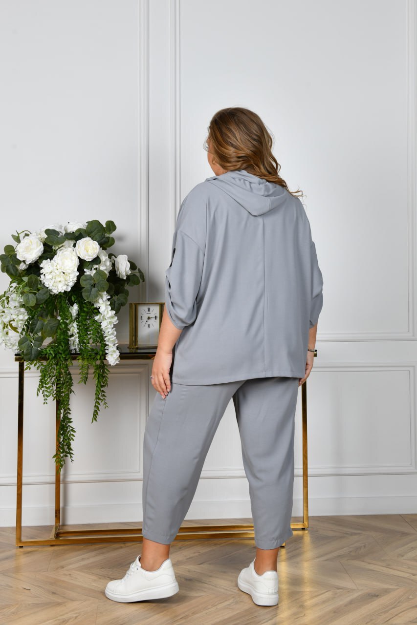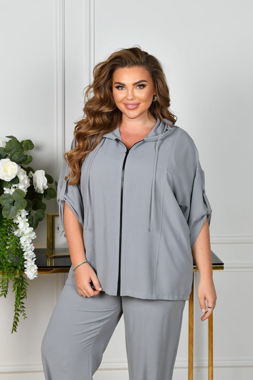 Туника на молнии с капюшоном. Силуэт свободный, прямой. Линия плеча спущена, рукав длиной ниже локтя, можно укорачиваться с помощью специальной детали на пуговице. В кулиске капюшона протянут шнурок. Можно надевать на майку (футболку) или самостоятельно.