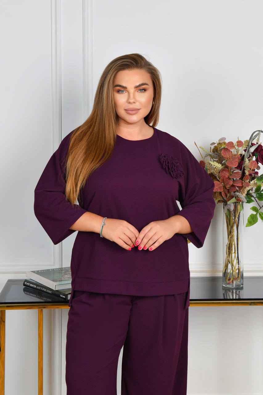 Туника свободного прямого силуэта, вырез горловины круглый, 3/4 рукав. Низ асимметричный, с небольшими разрезами. Туника декорирована розой из основной ткани (при необходимости можно снять). Карманов и застежек нет.
