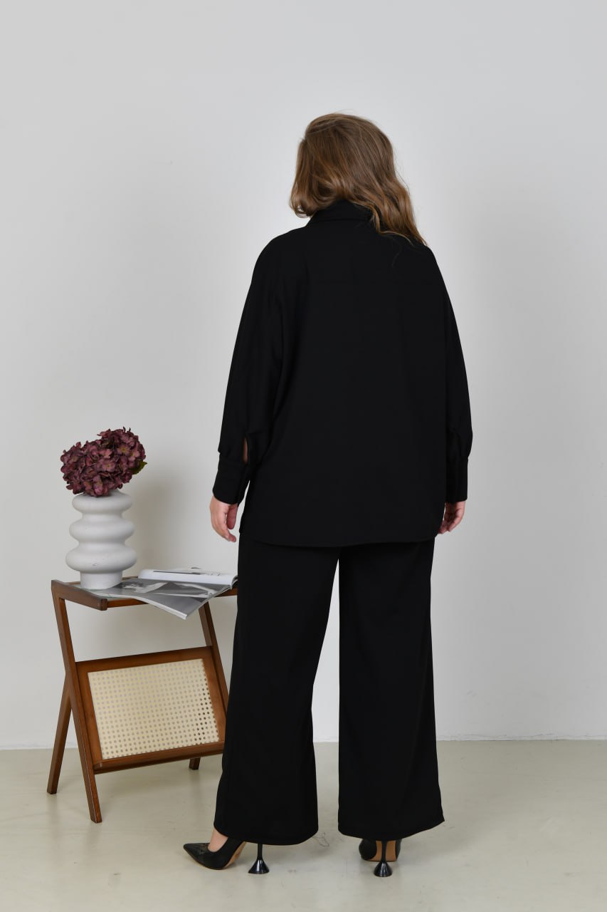 Рубашка свободного прямого силуэта, воротничок стояче-отложен. Застегивается на пуговицы по передней планке. По бокам небольшие разрезы. Рукав длинный, на манжете, застегивается на пуговицу.