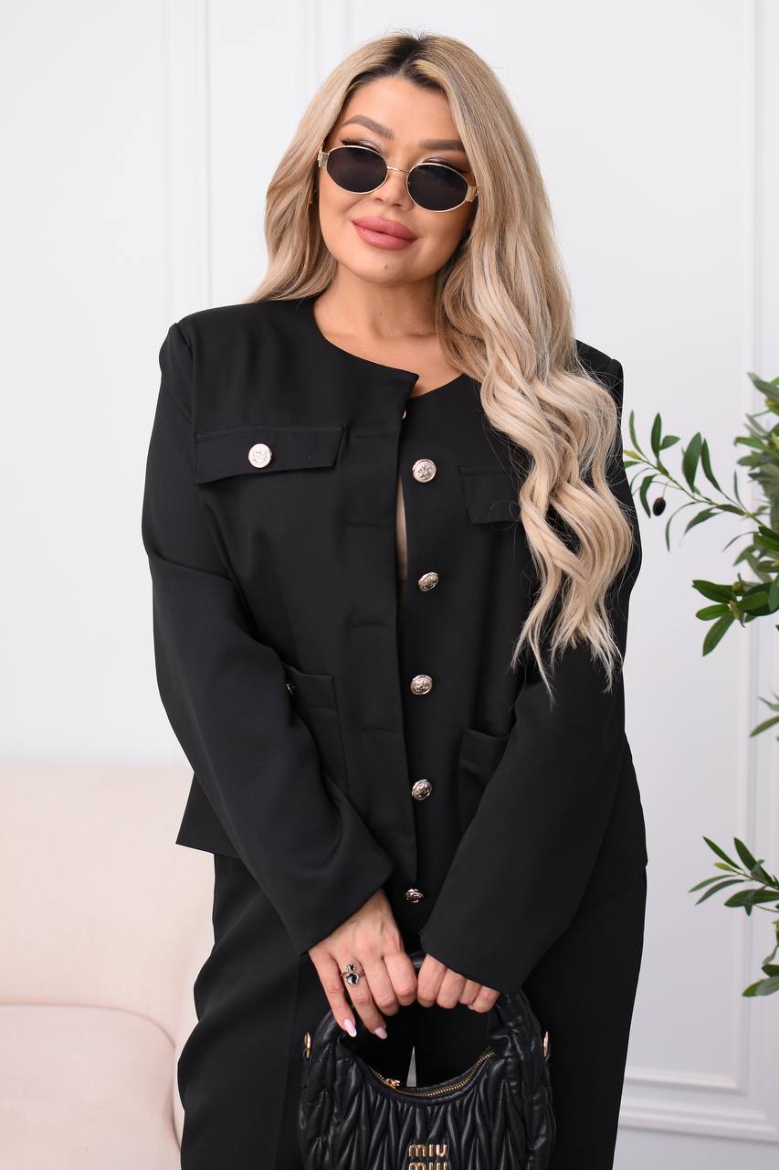 Классический костюм на подкладке. Пиджак на пуговицах, карманы накладные рабочие, штанишки по низу палаццо. Идеальный вариант как офисный look, празднично-деловой или прогулочный. Хорошо садится по фигуре.