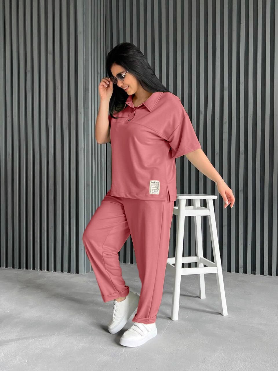 Комфортный прогулочный костюм из двунити: брюки и футболка. Брюки имеют два кармана и украшены манжетом, пояс на резинке. Футболка украшена нашивкой и двумя разрезами по бокам, рукав спущен, горловинка застегивается на кнопки и имеет складной воротник.