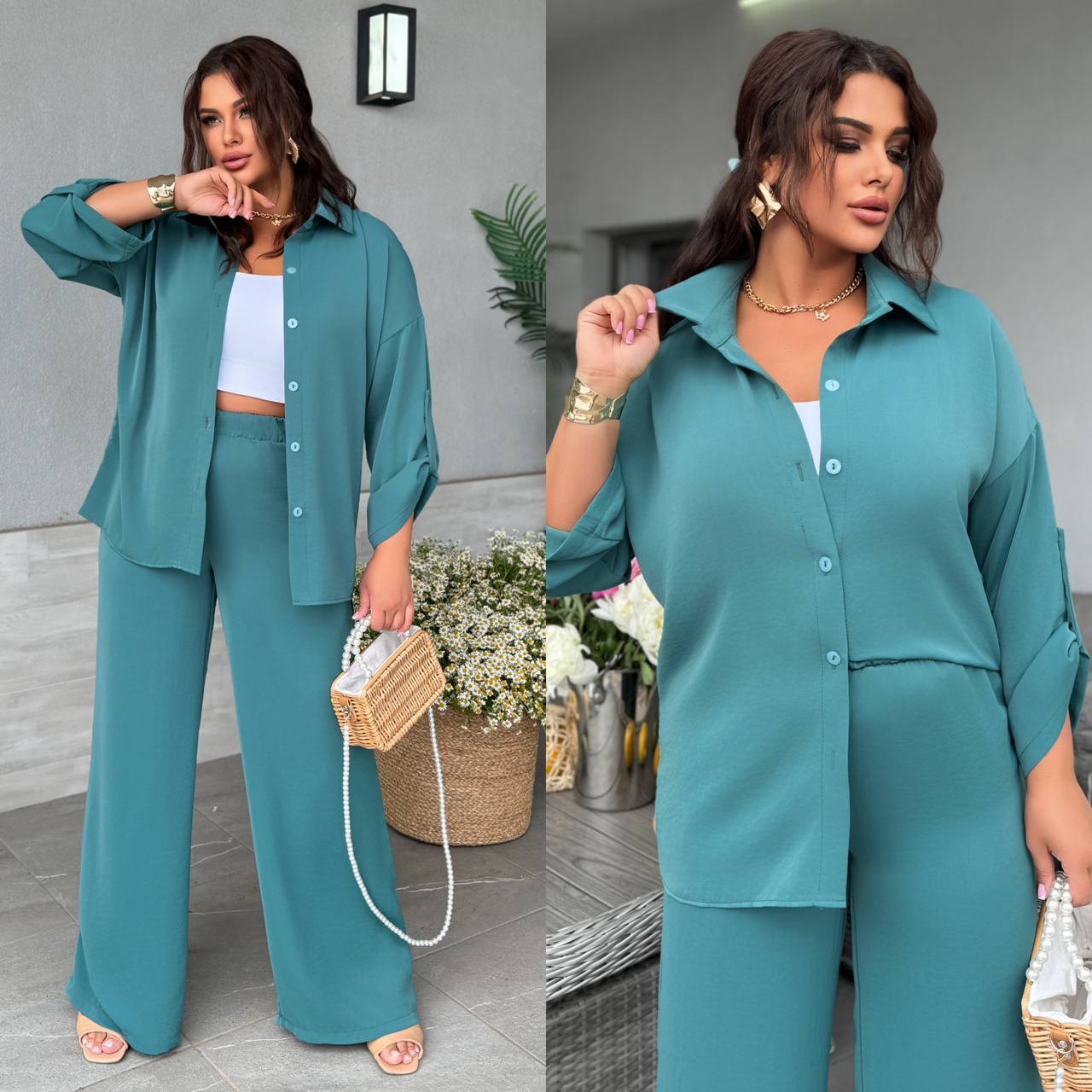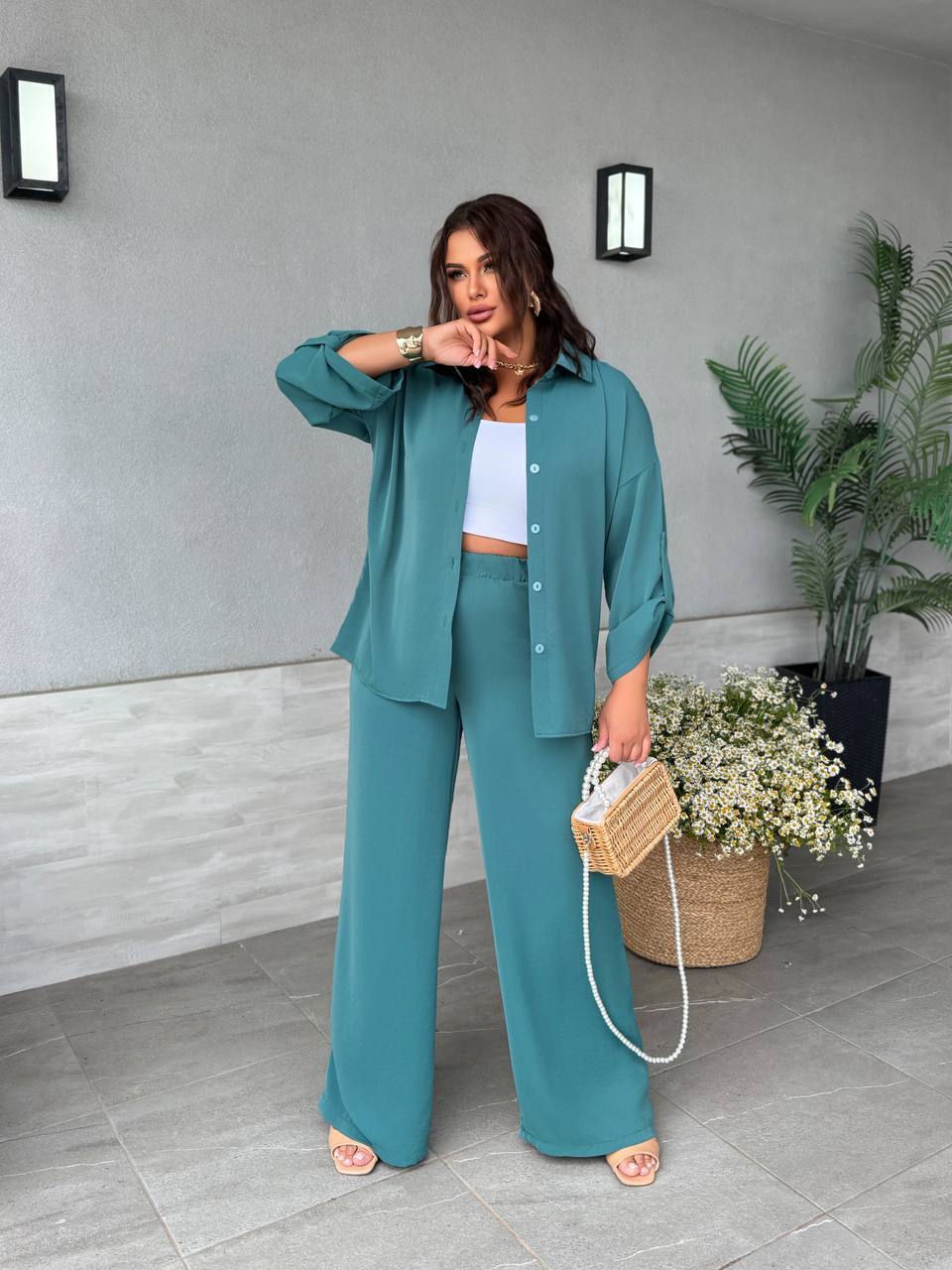 ✨Рубашка на пуговицах, с классическим отложным воротником. Рукав — трансформер. Брюки свободного кроя, на резинке, с боковыми карманами.