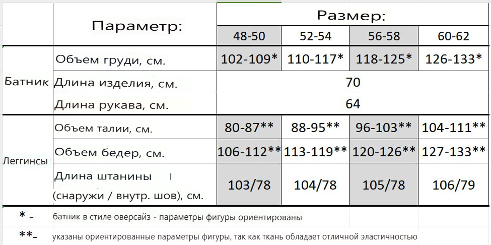 Леггинсы — ориентировочные параметры фигуры (эластичная ткань):