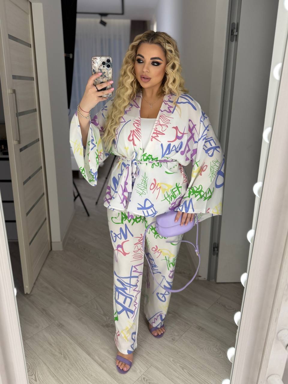 Материал: софт-шелк (легкая, приятная на ощупь, мало мнущаяся ткань). Длина брюк 77/110. Пояс на резинке, высокая посадка. Кардиган одевается на запах, подвязывается поясом. Рукава внизу широкие, есть съемные завязки, которыми можно сделать другую форму рукава, завязав их. Замеры по изделию: