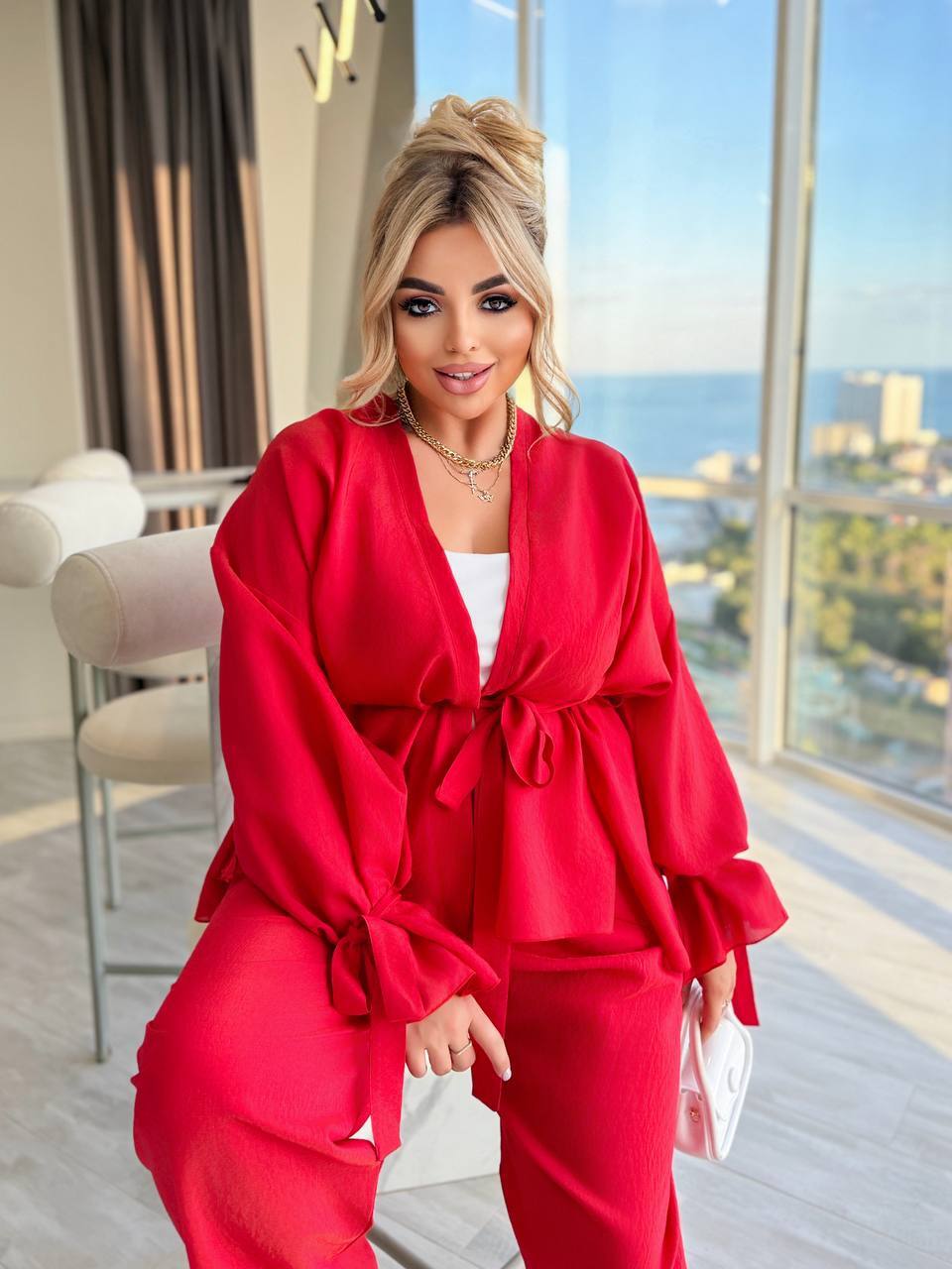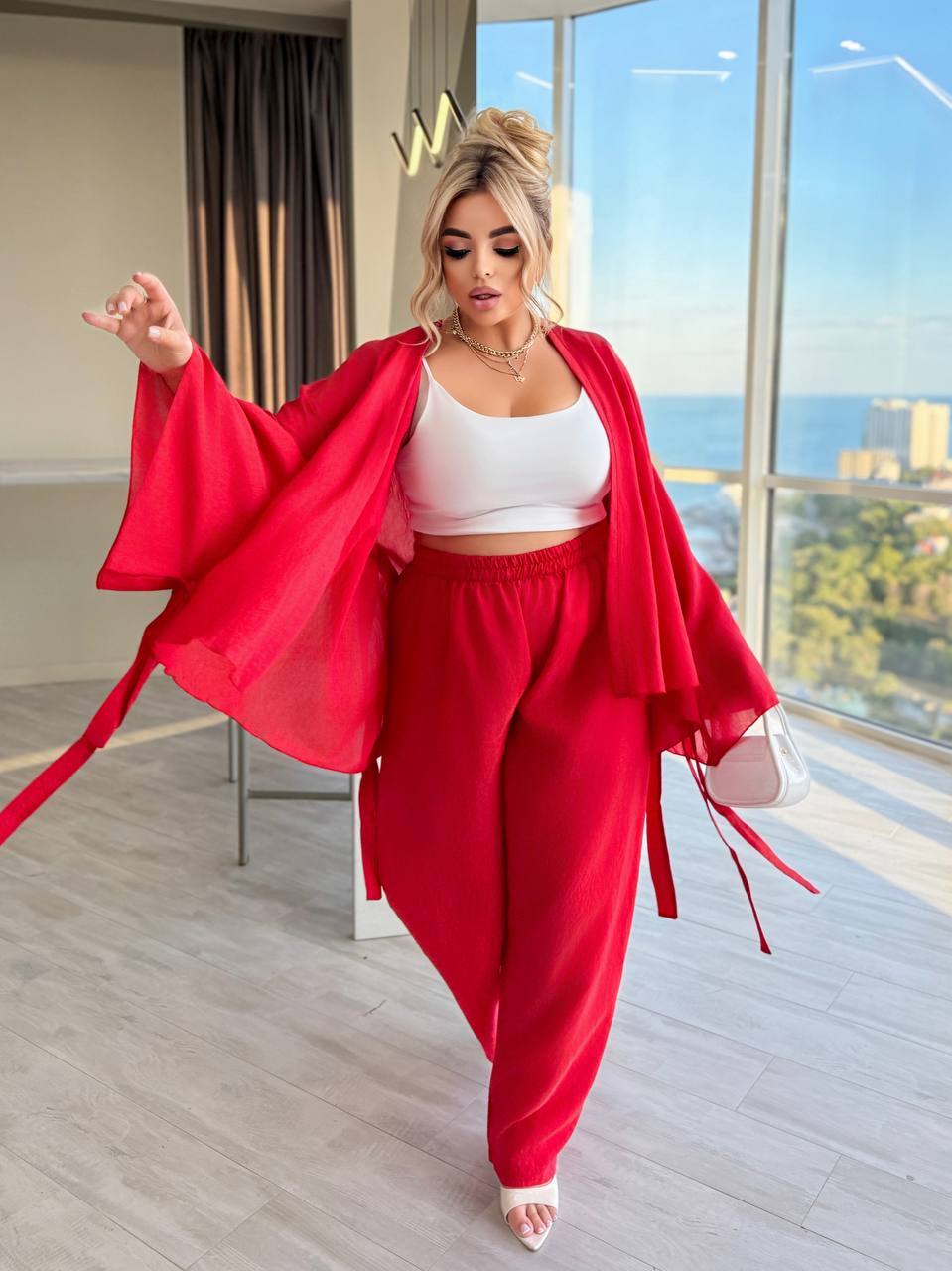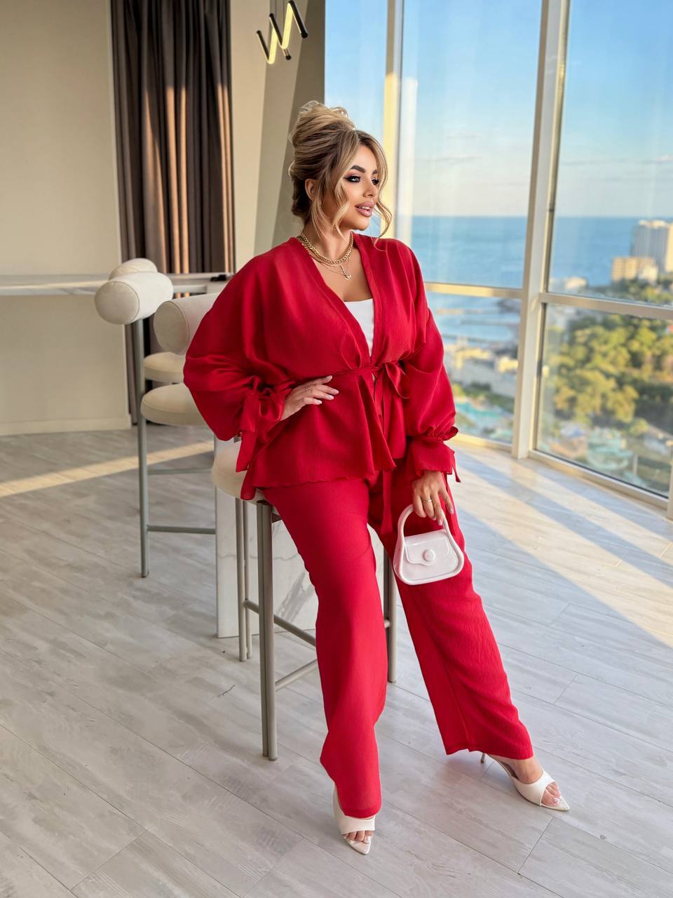 Длина брюк 77/110. пояс на резинке, высокая посадка. кардиган одевается на запах, подвязывается поясом. рукава внизу широкие, есть съемные завязки, которыми можно сделать другую форму рукава, завязав их. замеры по изделию:
