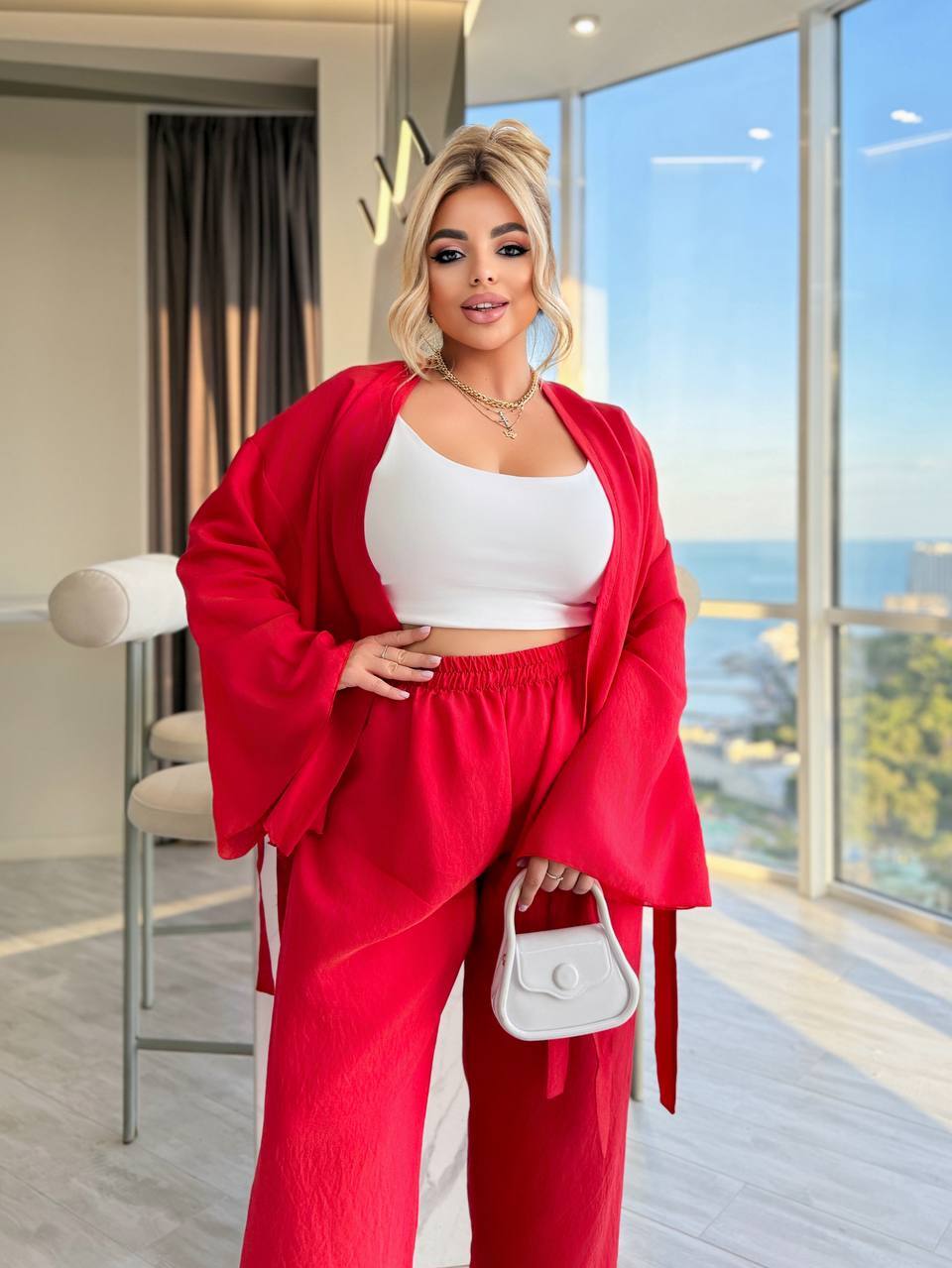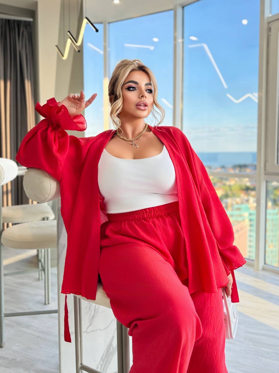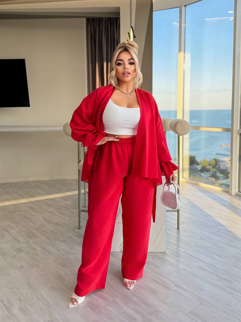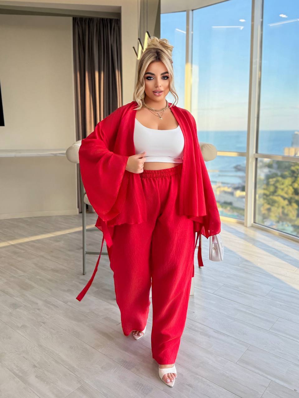Длина брюк 77/110. пояс на резинке, высокая посадка. кардиган одевается на запах, подвязывается поясом. рукава внизу широкие, есть съемные завязки, которыми можно сделать другую форму рукава, завязав их. замеры по изделию: