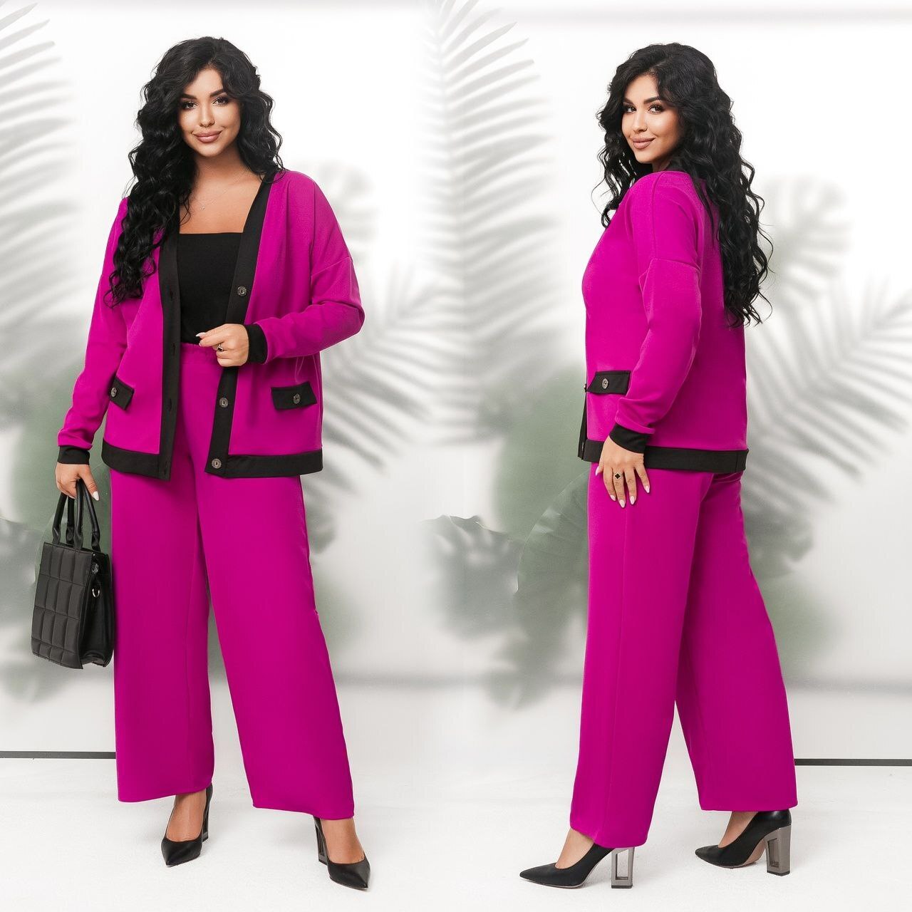 Практичный стильный костюм, брюки прямого покроя, с боковыми карманами, пояс на резинке. Кофта прямого покроя, на пуговицах. Ткань хорошего качества, износостойкая, приятна на ощупь.