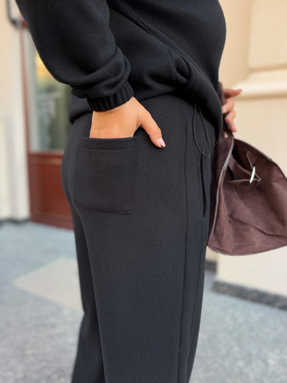 Брюки прямого кроя с лампасами украшены перестрочками. Вдоль боков карманы, перестроченные, как в кофте рамкой.