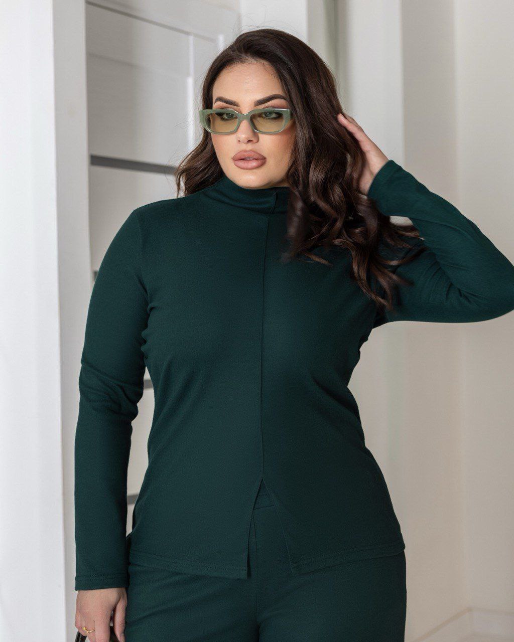 Кофта с высокой горловиной, на груди декоративные складки, перед отсрочкой по середине, а также разрезом.