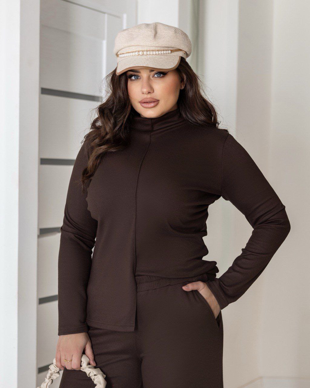 Кофта с высокой горловиной, на груди декоративные складки, перед отсрочкой по середине, а также разрезом.