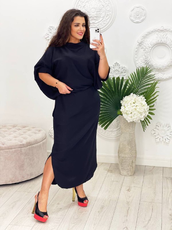 Свободная кофта с рукавом до локтя, маленькая стойка на воротнике, юбка на широкой резинке, по бокам разрезы.