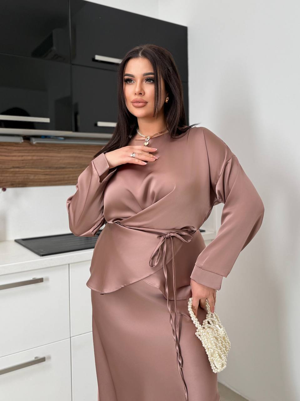 Низ комплекта – атласная юбка длины меди, свободного силуэта, что делает образ элегантным и комфортным. Весь образ выглядит стильно, женственно и элегантно, идеально подходящий для особых случаев или вечернего выхода.