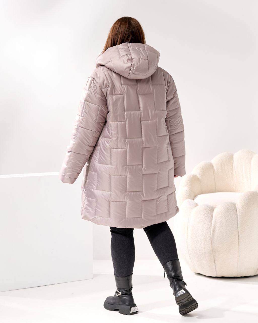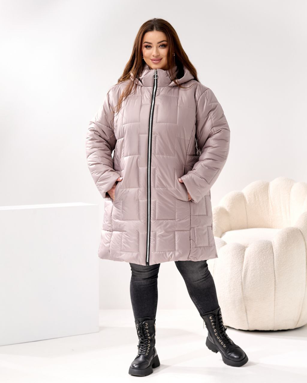Стильная очень теплая женская куртка, прямого покроя. Застегивающаяся на молнию по центру. Есть высокий воротник-стойка, который защищает шею от ветра и глубокий капюшон. Рукава длинные, слегка свободные. Ткань куртки имеет легкий блеск, что придает образу чистоплотного вида.