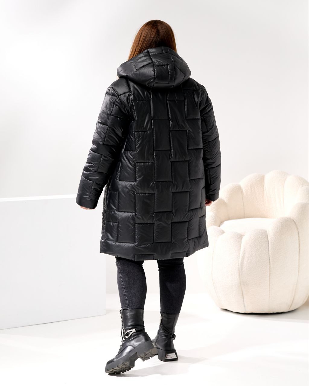 Стильная очень теплая женская куртка, прямого покроя. Застегивающаяся на молнию по центру. Есть высокий воротник-стойка, который защищает шею от ветра и глубокий капюшон. Рукава длинные, слегка свободные. Ткань куртки имеет легкий блеск, что придает образу чистоплотного вида.