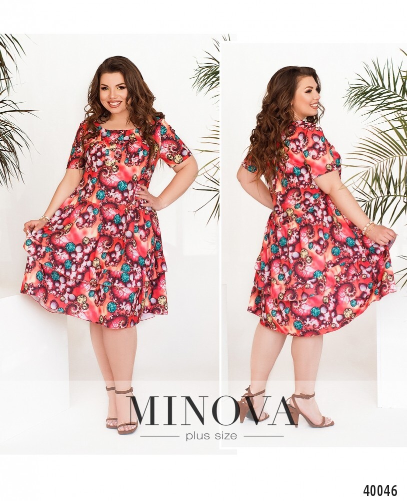 Яркое и стильное платье большого размера с очень оригинальным и радостным принтом. платье с оборками и плиссированной тканью на груди, также под горловиной три декоративных прозрачных пуговки. рукава без манжет. застёжек и карманов нет.