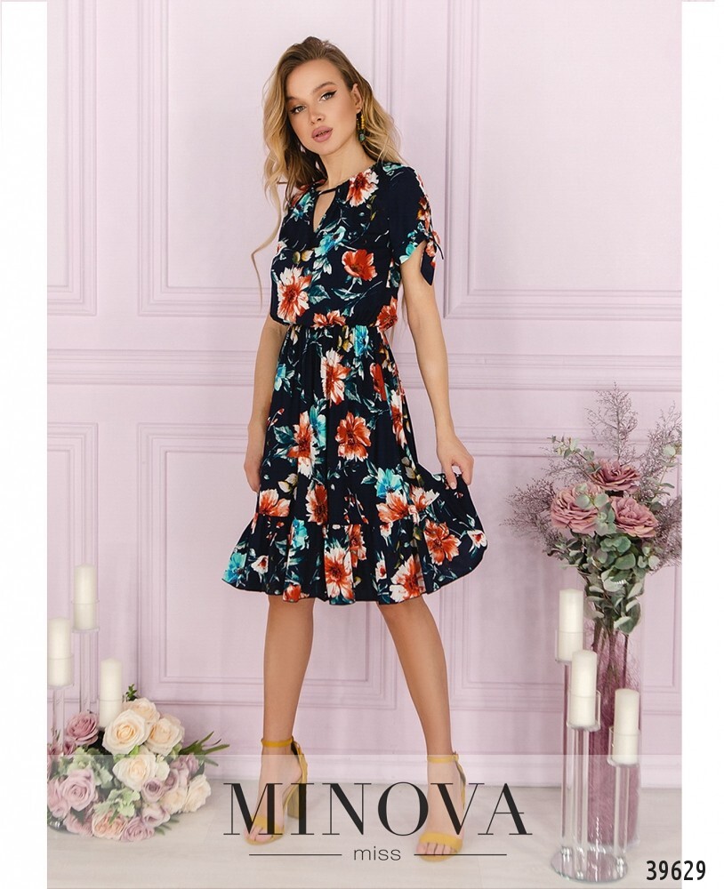 Стильное платье с цветочным принтом и завязками на v-образных вырезах спереди и по спинке. рукава короткие, с манжетами, которые можно завязать на бант. без застёжек и карманов. по низу подола подшиты оборки. подол подшит к верху, в пояс вшита резинка. Ориентировочные замеры по готовому изделию: 42 р-р: длина платья 96см, длина рукава от горловины 29см, длина рукава от плечевого шва 18см, обхват рукава 42см, ог - 88см, от -72см. 44 р-р: длина платья 96см, длина рукава от горловины 29см, длина рукава от плечевого шва 18см, обхват рукава 44см, ог - 90см, от -75см. 46 р-р: длина платья 96см, длина рукава от горловины 29см, длина рукава от плечевого шва 18см, обхват рукава 46см, ог - 92см, от -78см. 48 р-р: длина платья 96см, длина рукава от горловины 29см, длина рукава от плечевого шва 18см, обхват рукава 44см, ог - 94см, от -81см. Рекомендации по уходу: ручная стирка при температуре не более 30 градусов *замеры могут отличаться от указанных на +-2см в зависимости от особенностей ткани, техническим особенностям пошива, степенью усадки ткани **в зависимости от цветопередачи вашего монитора, оттенок изделия может немного отличаться ***в зависимости от партии фурнитура в изделии может меняться
