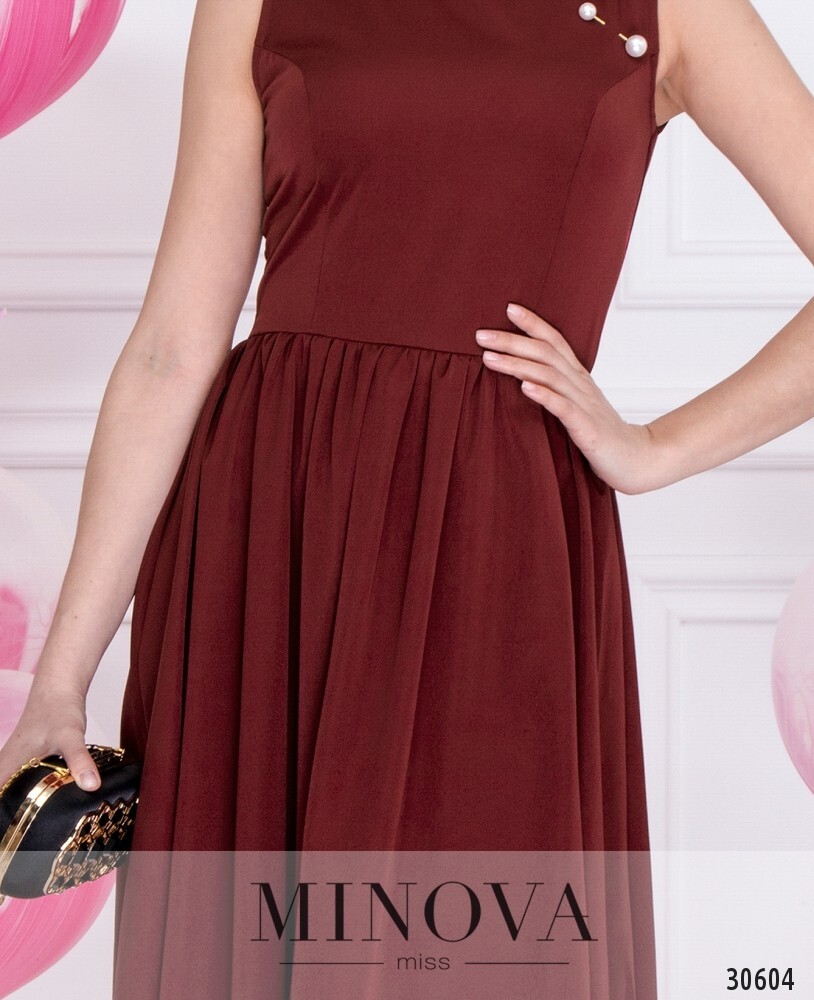 Воздушное платье с разно уровневым подолом. отрезной лиф без рукавов украшен брошью с бусинами. расклешенный подол собран в складки и укорочен на лицевой стороне. на спине платье застегивается на фактурную молнию.
